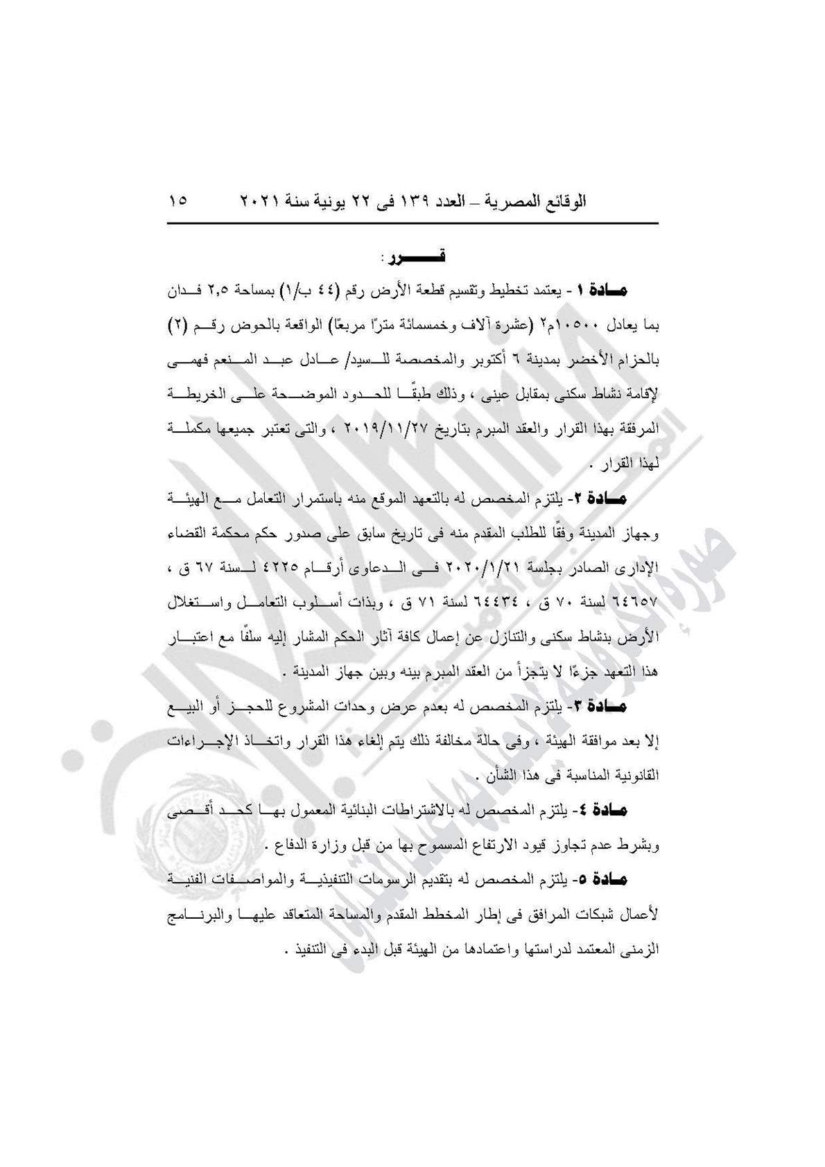 وجاء في المادة الثانية للقرار "يلتزم المخصص له بالتعهد الموقع منه باستمرار التعامل مع الهيئة وجهاز المدينة وفقًا للطلب المقدم منه، في تاريخ سابق على صدور حكم محكمة القضاء الإداري الصادر بجلية 21 /1 /2020، في الدعاوى أرقام (4225 لسنة 67 ق، و64657 لسنة 70 ق، و64434 لسنة 71 ق) وبذات أسلوب التعامل واستغلال الأرض بنشاط سكني والتنازل له عن أعمال كافة آثار الحكم.