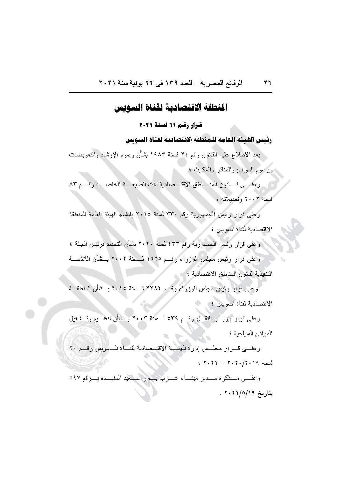نشرت جريدة الوقائع المصرية في عددها رقم 139، الصادر في 22 يونية 2021، قرار المنطقة الاقتصادية لقناة السويس رقم 61 لسنة 2021، بشأن السماح لليخوت السياحية بالتراكى على أرصفة ميناء غرب بور سعيد للتموين بالوقود والمياه والاحتياجات الأخرى أو تسليم مخلفات السفن لمقاولى الأشغال أثناء انتظارها بالمسطح المائى لميناء غرب بور سعيد أو فى نادى اليخت التابع لهيئة قناة السويس، أو أثناء عبورها لقناة السويس ، وذلك خلال الفترة (شهر أو جزء من الشهر) دون تحصيل أى رسوم إضافية.