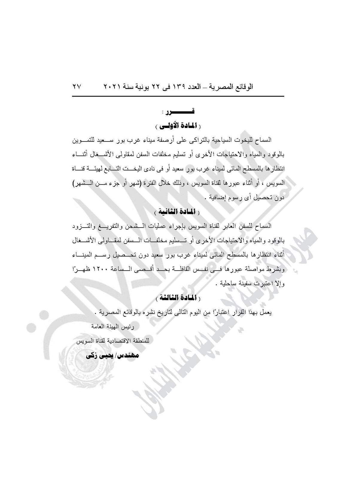 وينص القرار في مـادته الأولى على السماح لليخوت السياحية بالتراكى على أرصفة ميناء غرب بور سعيد للتموين بالوقود والمياه والاحتياجات الأخرى أو تسليم مخلفات السفن لمقاولى الأشغال أثناء انتظارها بالمسطح المائى لميناء غرب بور سعيد أو فى نادى اليخت التابع لهيئة قناة السويس، أو أثناء عبورها لقناة السويس، وذلك خلال الفترة (شهر أو جزء من الشهر) دون تحصيل أى رسوم إضافية.