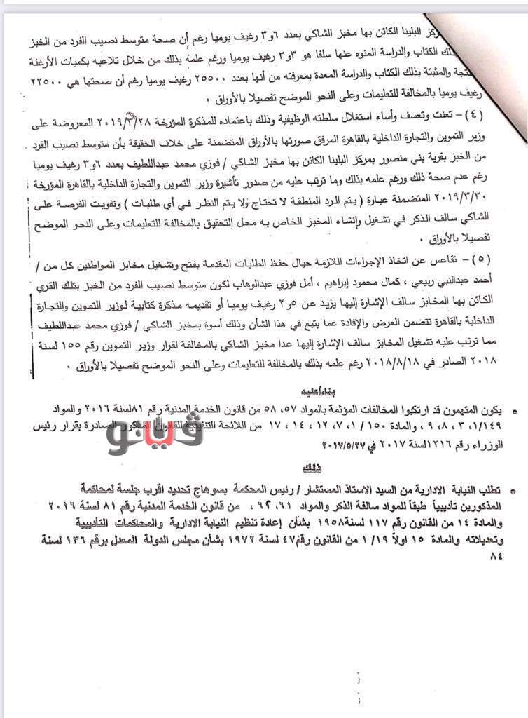 وتقاعس المحال عن إتخاذ الإجراءات اللازمة حيال إبلاغ جهة رئاسته لإخطار وزارة التموين بما يفيد سبق اعداده دراستين ووجههما الى رئيس قطاع مكتب وزير التموين بإحتساب متوسط نصيب الفرد في مخبزين، من الخبز، وأحتفظ بطلب الشاكي دون تسليمه الى لجنة معاينات المخابز البلدية المستجدة بشأن اجراء معاينة لمخبزه الكائن بمركز البلينا مما ترتب عليه عدم تشغيل المخبز، وبلغت المخالفات التي إرتكبها المخالف بشأن المخابز 13 مخالفة إدارية وقانونية جسيمة.