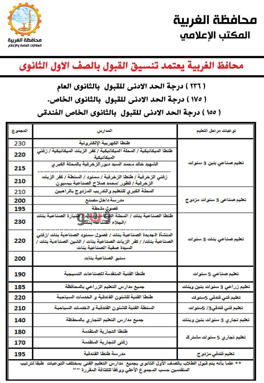 وتقرر أن يكون الحد الأدنى للقبول بالثانوي العام ( ٢٣٦) درجة، والحد الأدنى للقبول بالثانوي الخاص ( ١٧٥) درجة والحد الأدنى للقبول بالثانوي الخاص الفندقي ( ١٥٥) درجة ، على أن يكون الحد الأدنى للقبول بالصف الأول الثانوي بمدارس التعليم الفني بنوعيتها طبقا للجدول المرفق.