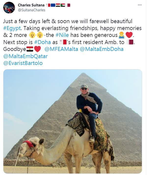 وكتب تشارلز سلطانة تغريدة على تويتر: "بقيت أيام قليلة وقريباً سوف أودع مصر الجميلة.. أخذ صداقات أبدية وذكريات سعيدة... كان النيل كريمًا.. والمحطة التالية هي الدوحة كأول سفير مقيم لمالطا في قطر.. وداعًا مصر".