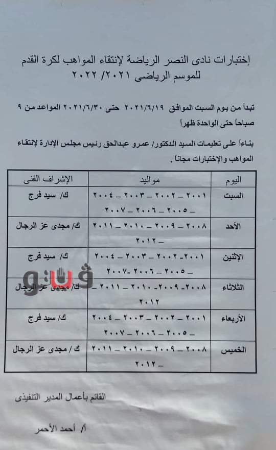 وأعلن نادي النصر إقامة اختبارات الناشئين 2021، مجانا من 19 يونيو الجاري حتى نهاية الشهر.