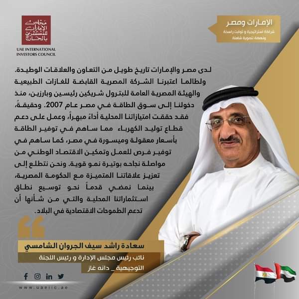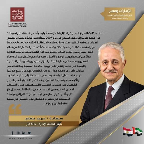ومن جانبه قال حميد جعفر رئيس مجلس إدارة دانة غاز أن مساهمات الشركة وأنشطتها واستثماراتها بقطاع الغاز المصري نجحت في توفير كميات إضافية من الغاز لتلبية احتياجات توليد الطاقة بدلا من استخدام زيت الوقود الثقيل وهو مادعم بشكل كبير الاقتصاد المصري وساهمو في حماية البيئة مؤكدا على تطلع الشركة إلى مواصلة الاستثمار في مصر والاضطلاع بدور رئيسي في كتابة قصة إنجازاتها ونموها.