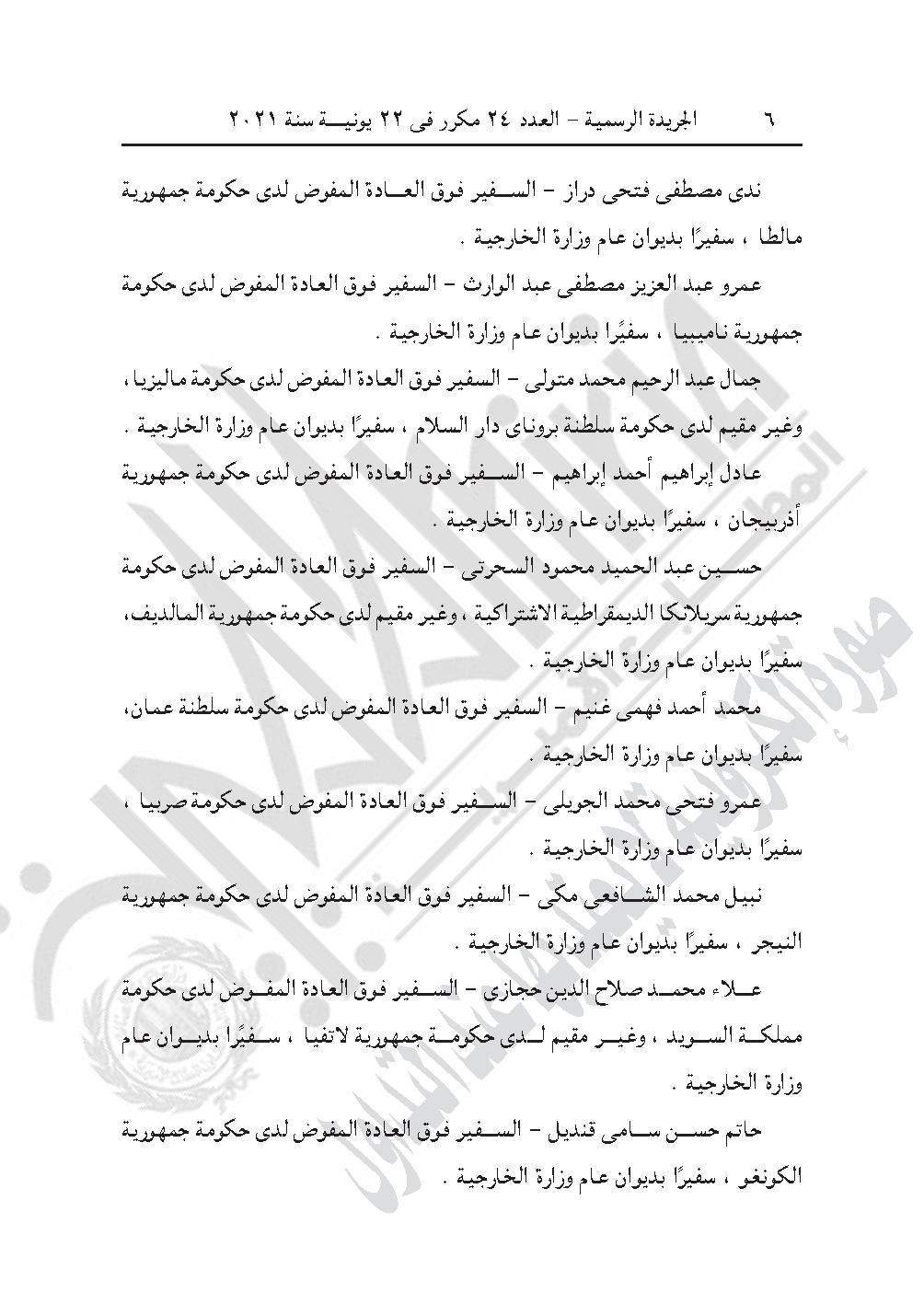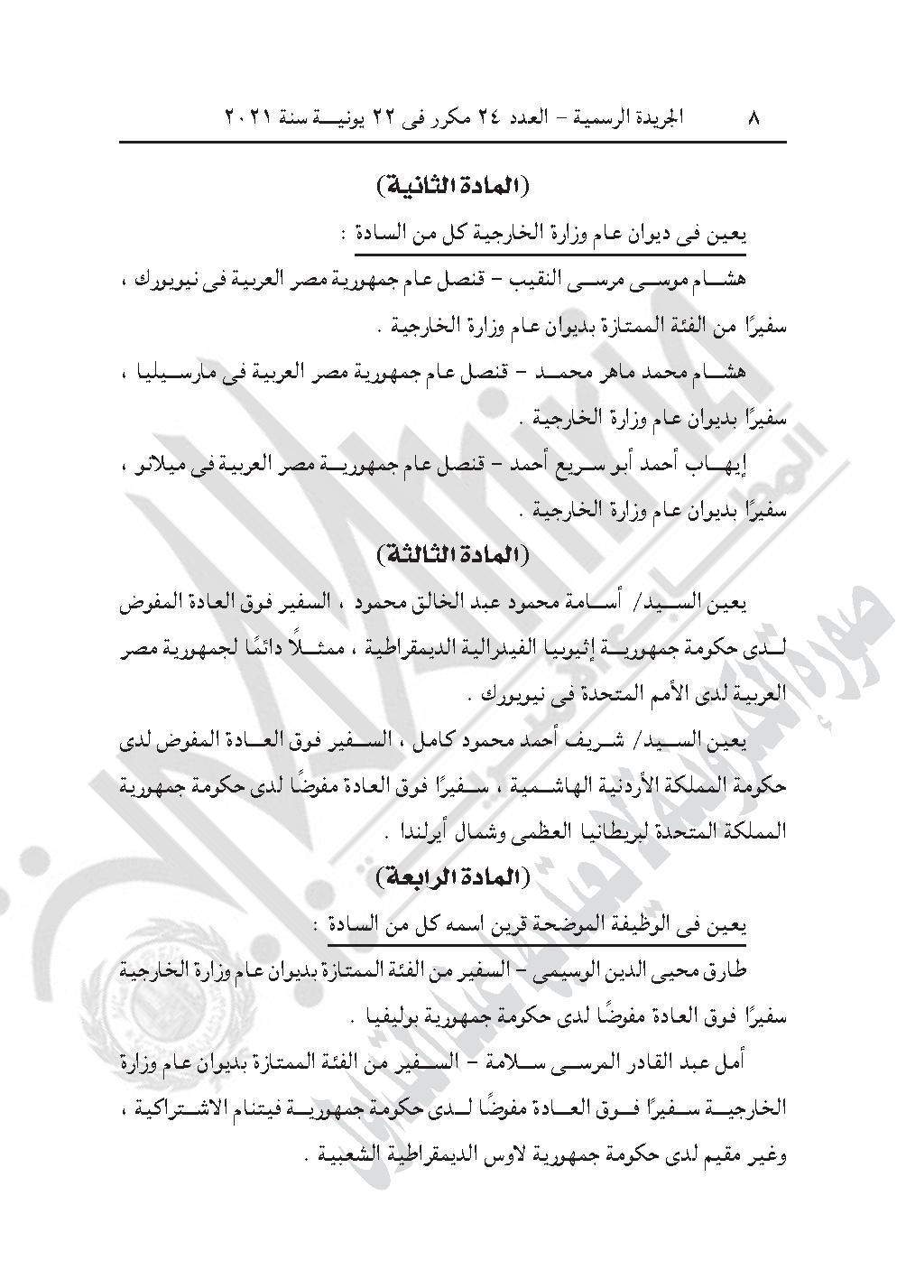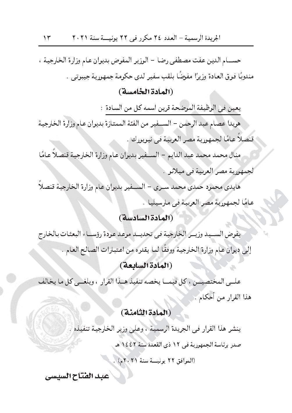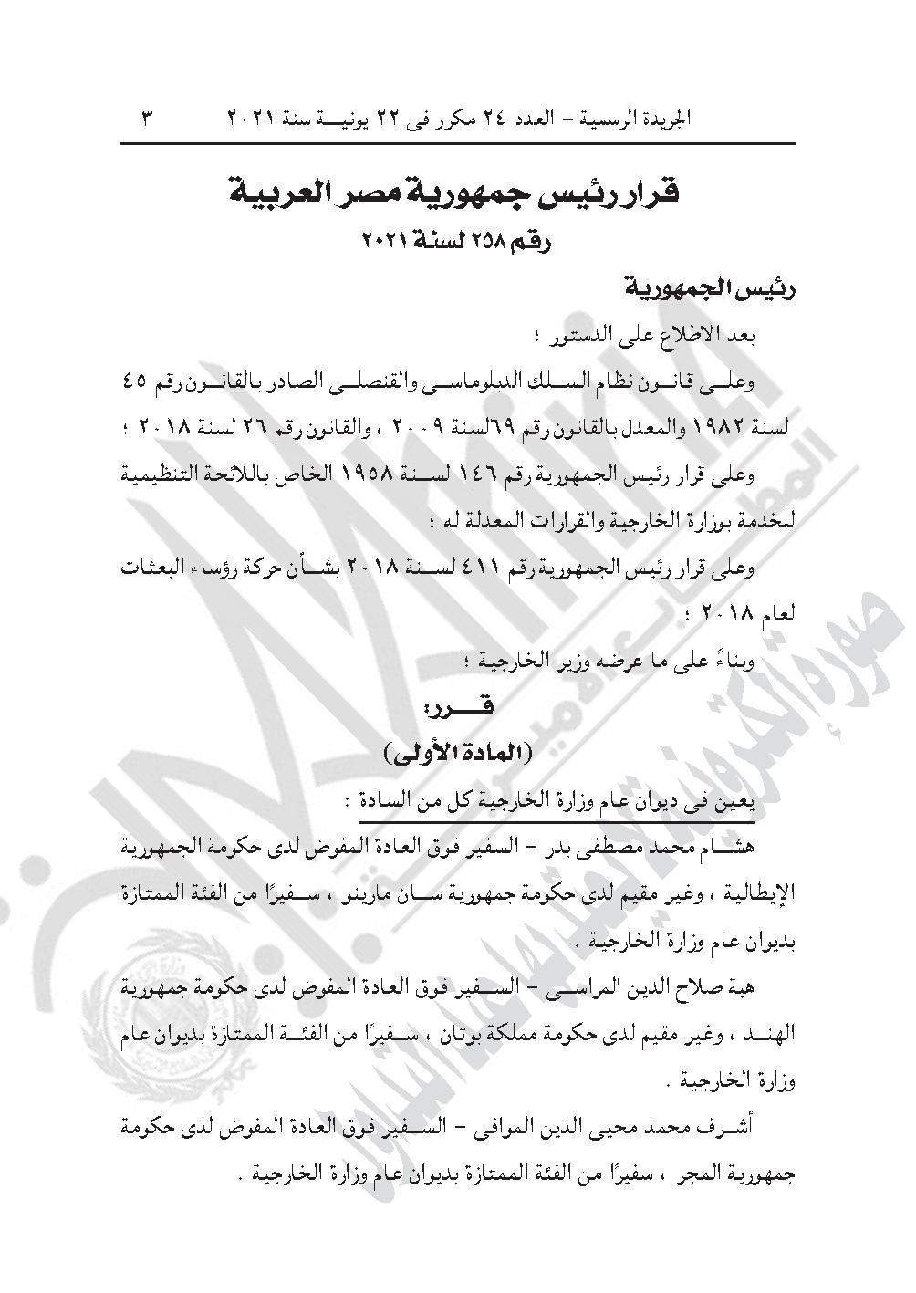 نشرت الجريدة الرسمية في عددها رقم 24 مكرر، الصادر في 22 يونية 2021، قرار رئيس جمهورية مصر العربية عبد الفتاح السيسي رقم 258 لسنة 2021، بشأن بعض التعيينات في ديوان عام وزارة الخارجية.
