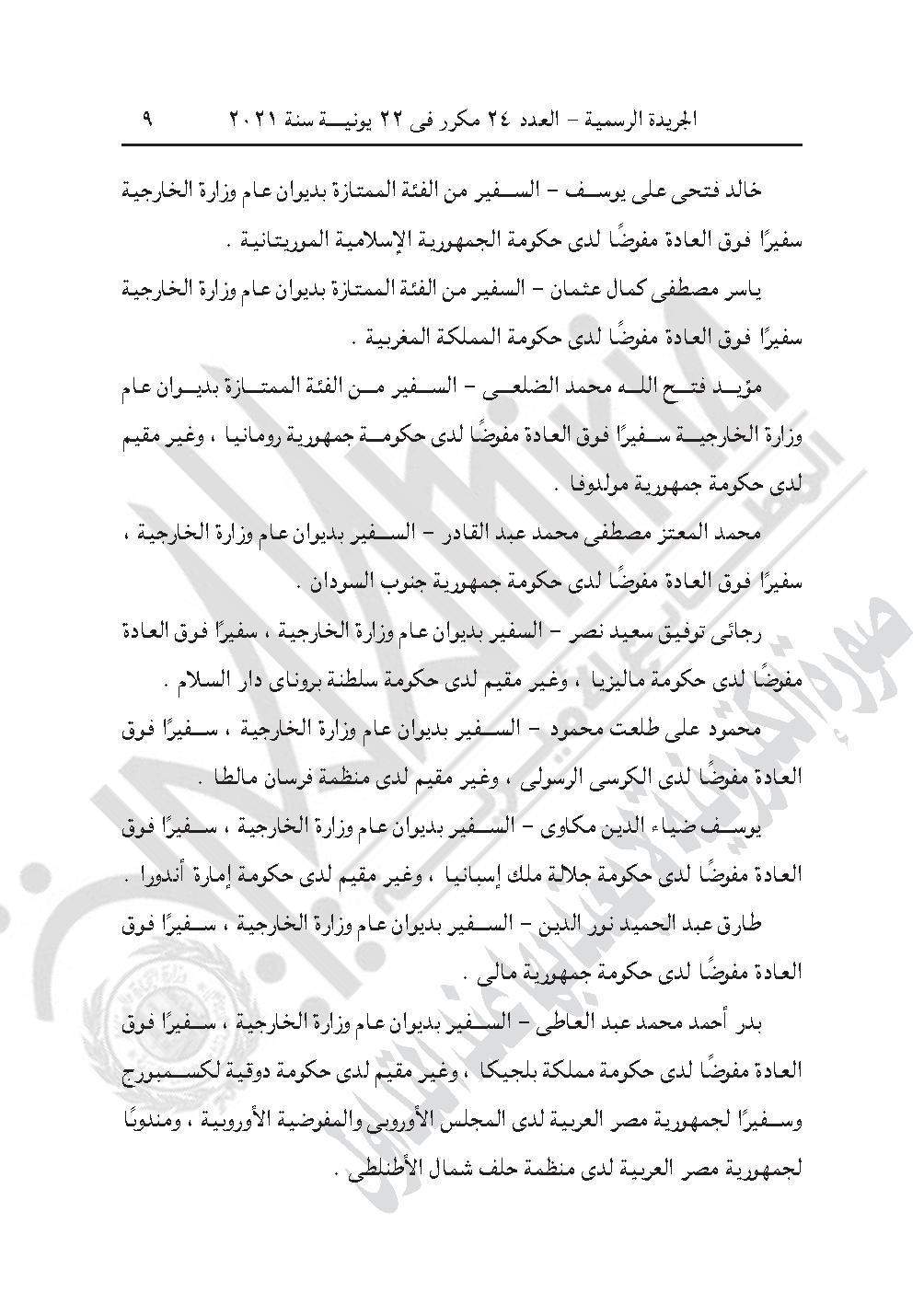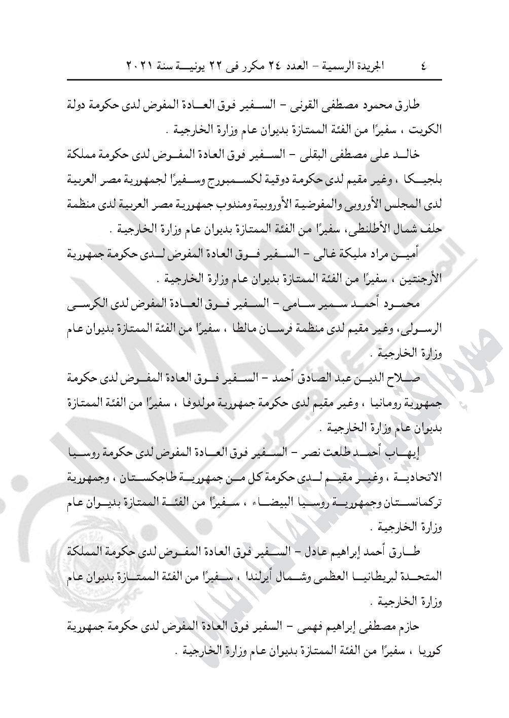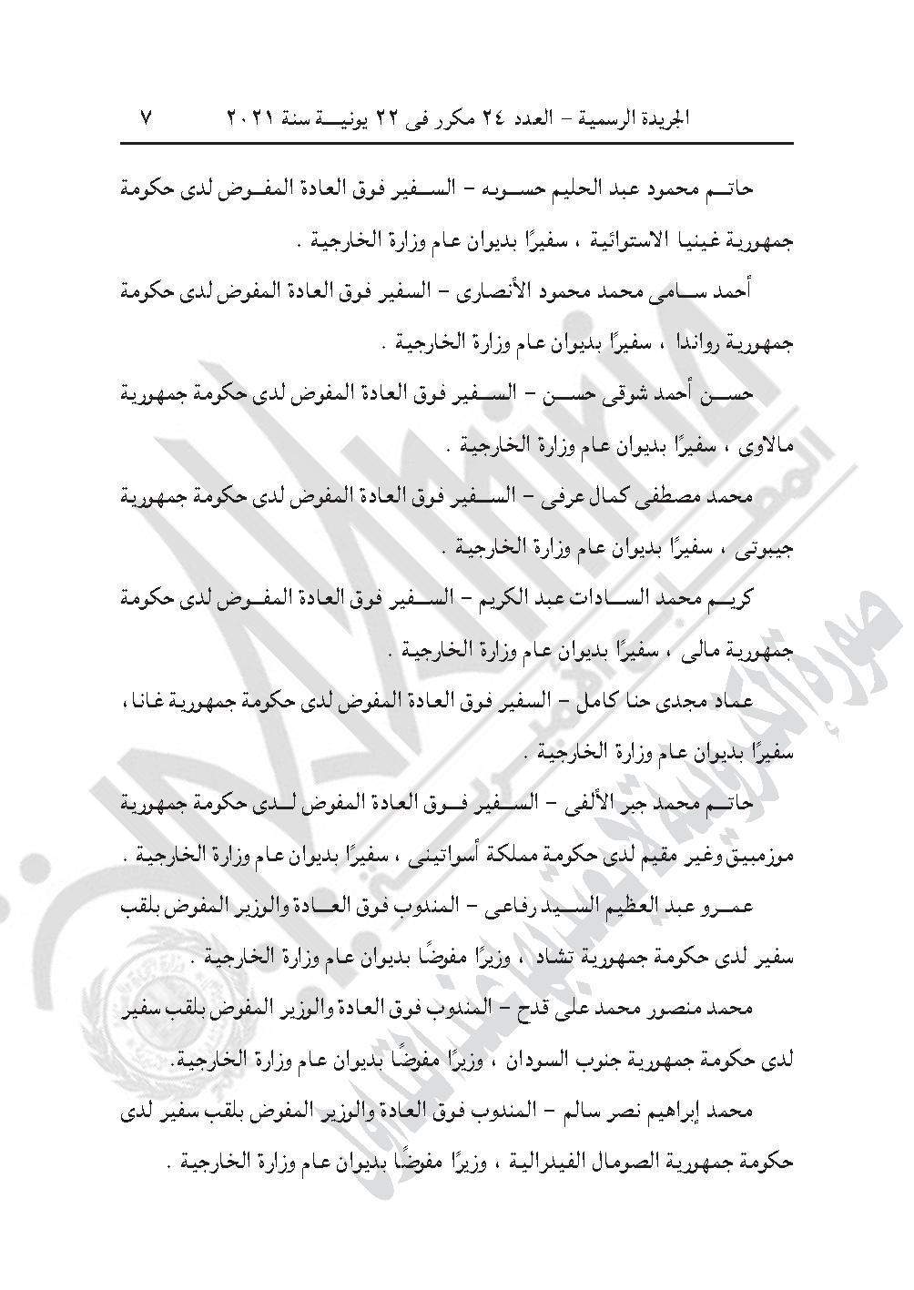 نشرت الجريدة الرسمية في عددها رقم 24 مكرر، الصادر في 22 يونية 2021، قرار رئيس جمهورية مصر العربية عبد الفتاح السيسي رقم 258 لسنة 2021، بشأن بعض التعيينات في ديوان عام وزارة الخارجية.