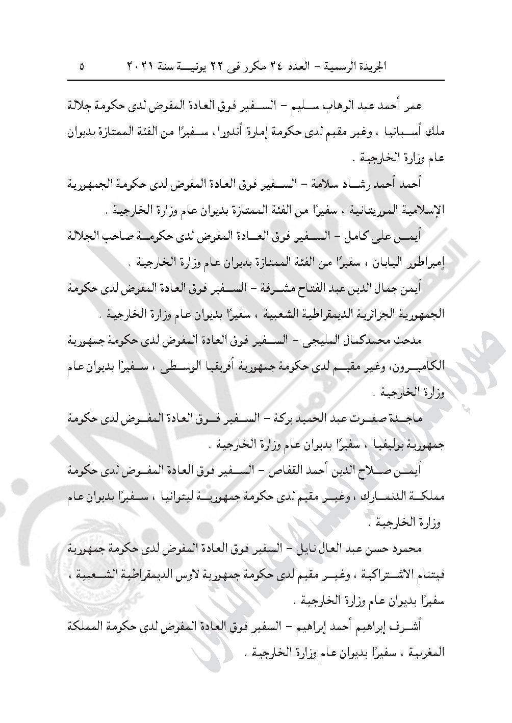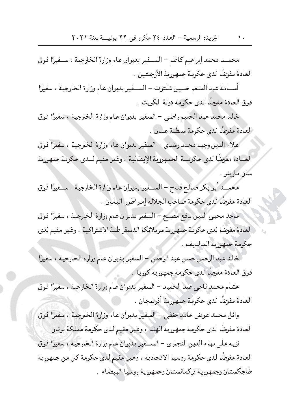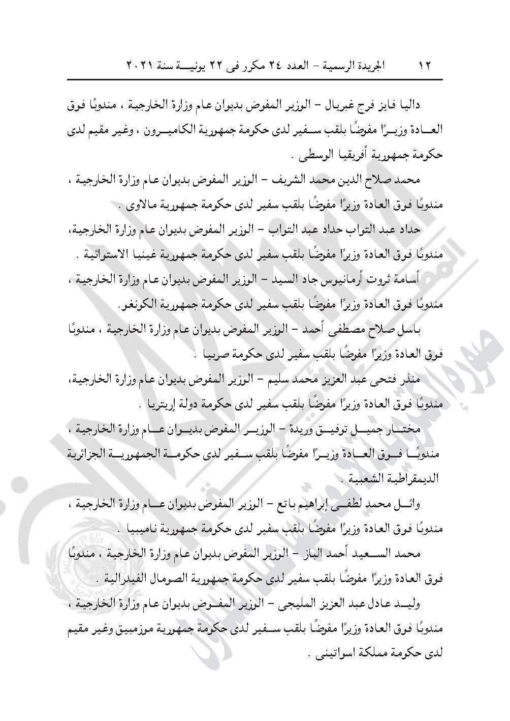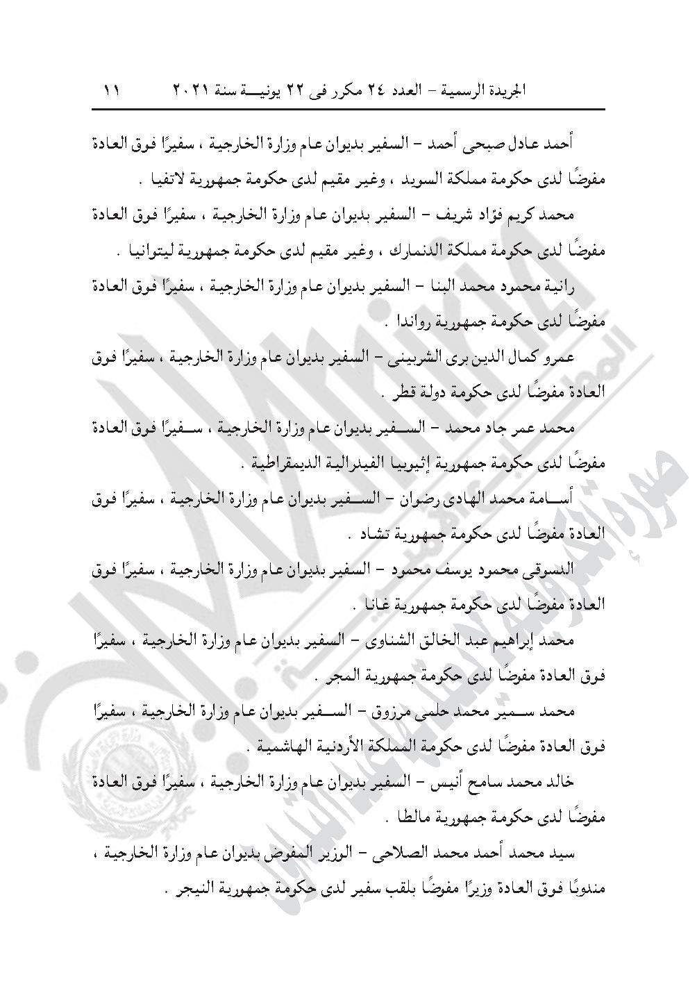 نشرت الجريدة الرسمية في عددها رقم 24 مكرر، الصادر في 22 يونية 2021، قرار رئيس جمهورية مصر العربية عبد الفتاح السيسي رقم 258 لسنة 2021، بشأن بعض التعيينات في ديوان عام وزارة الخارجية.