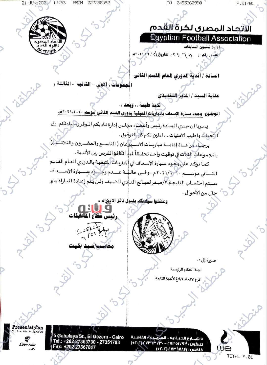 وأكد الفاكس الذي نشرته منطقة البحيرة لكرة القدم على صفحتها على فيس بوك أن اتحاد الكرة لن يقوم بإعادة أي مباراة تم إلغائها لعدم وجود سياراة الاسعاف بها، وذلك للتأكيد على وجود سيارات الإسعاف في المباريات المتبقية بدوري القسم الثاني.