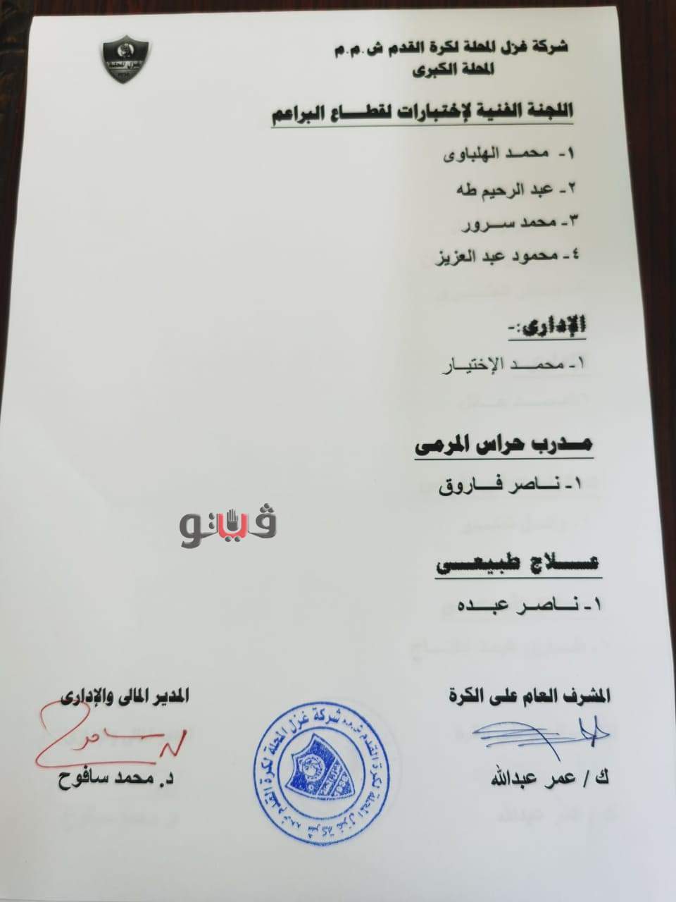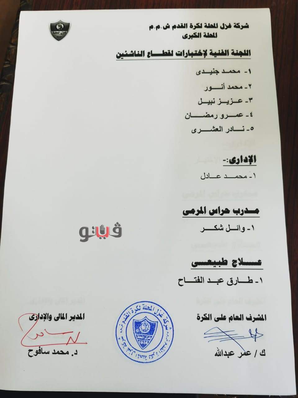 وحسب مصادر داخل النادي فمن المقرر تشكيل لجنة من مدربين ولاعبين سابقين بالنادي من اجل اختبار اللاعبين الجدد وذلك بالشكل الذي يضمن اختيار ناشئين يكون لديهم القدرة علي تمثيل الفريق الاول بالمحلة خلال الفترة المقبلة.