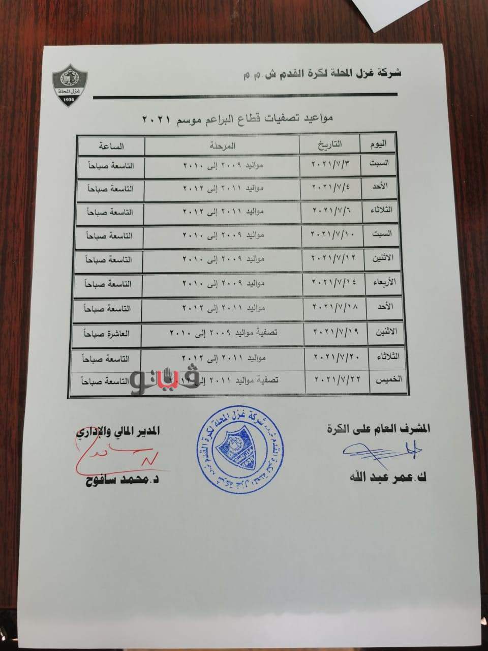 ومن المقرر ان يقوم مجلس إدارة نادي غزل المحلة برئاسة علي العباسي بعقد اجتماع مع المدربين الذين سيقودون الاختبارات وذلك في العاشرة من صباح الخميس المقبل بمقر شركة غزل المحلة لكرة القدم علي ان تبدأ الاختبارات في التاسعة من صباح السبت بعد القادم بملاعب الناشئين بغزل المحلة.