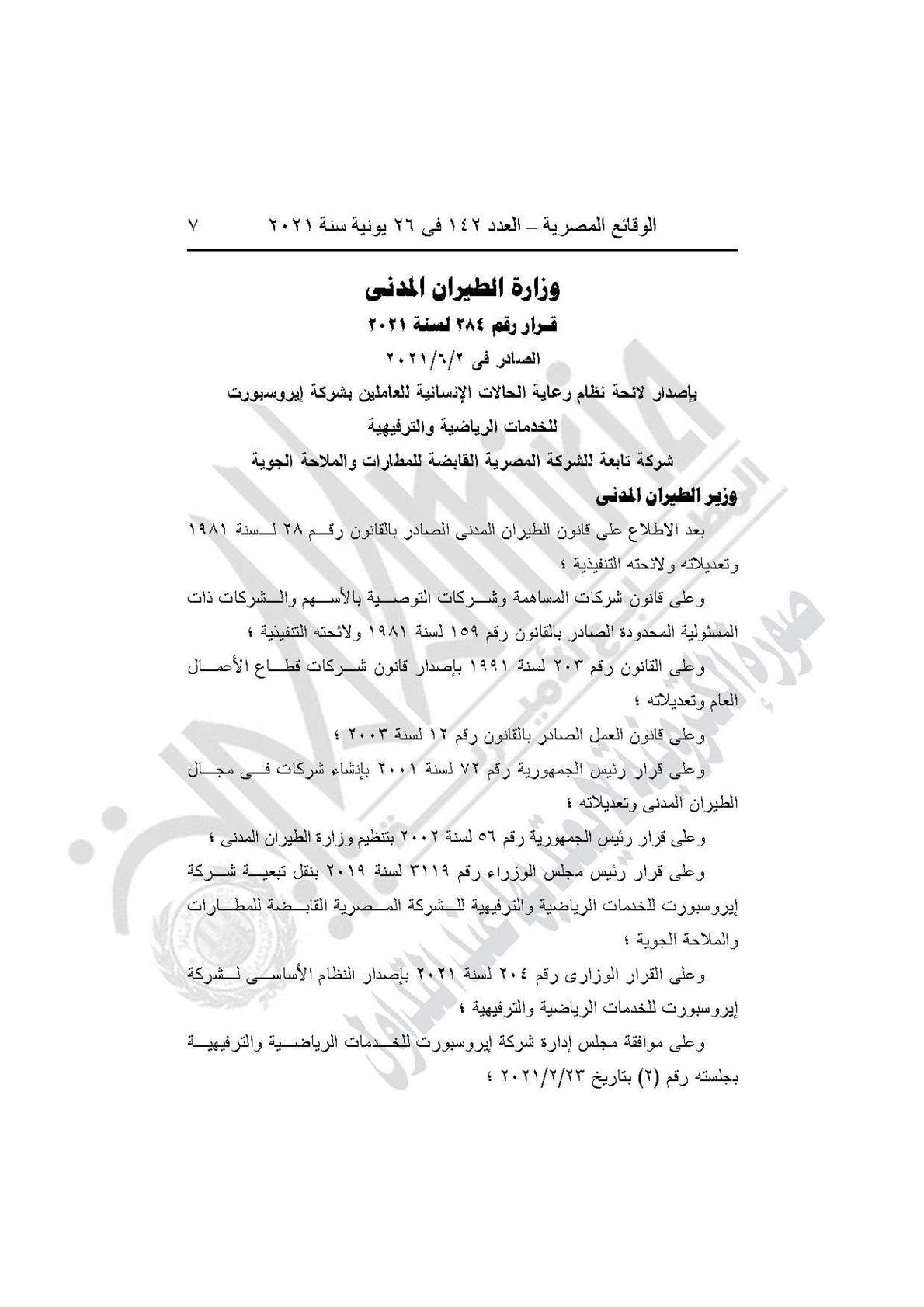 والقرار رقم 284 لسنة 2021، بإصدار لائحة نظام رعاية الحالات الإنسانية للعاملين بشركة إيروسبورت للخدمات الرياضية والترفيهية، شركة تابعة للشركة المصرية القابضة للمطارات والملاحة الجوية.