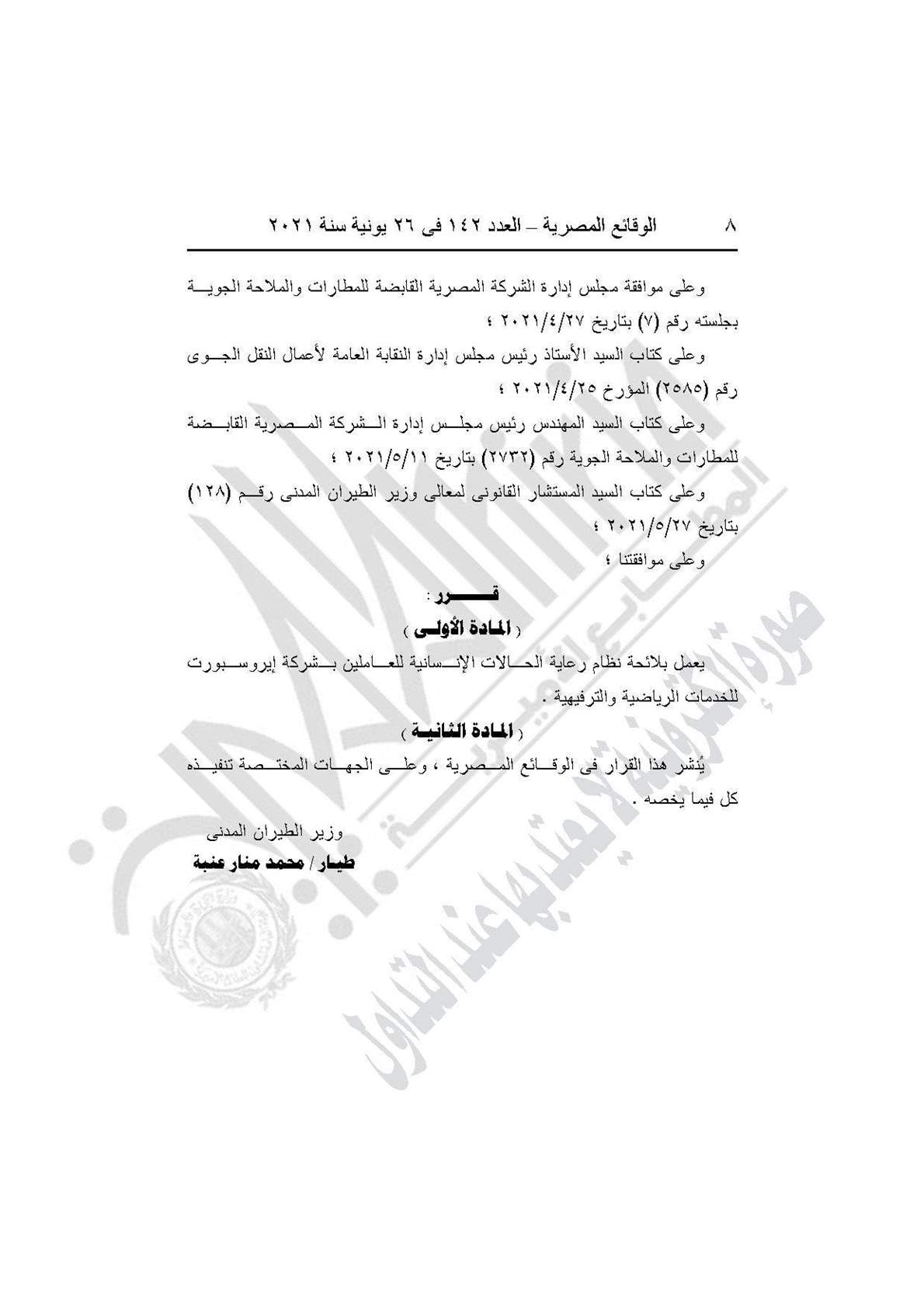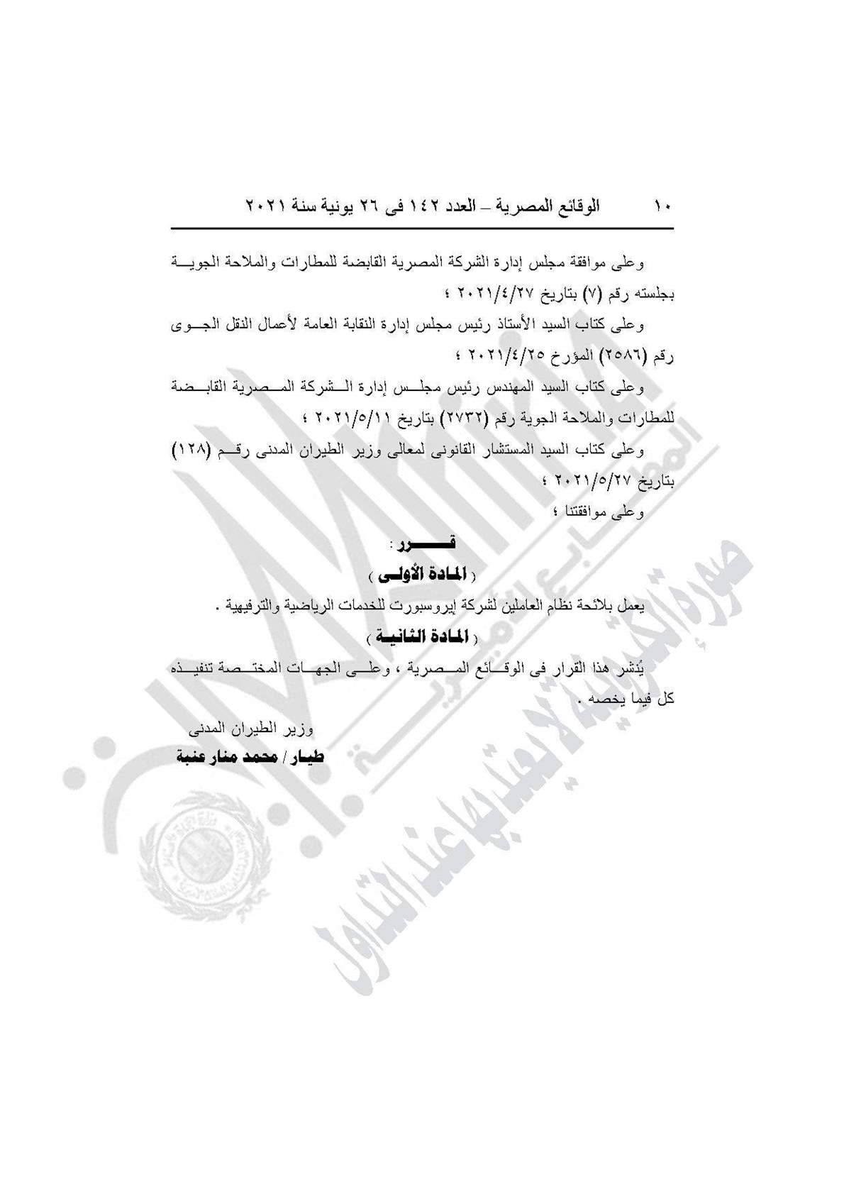 نشرت جريدة الوقائع المصرية في عددها رقم 142، الصادر في 26 يونيو 2021، 4 قرارات لوزارة الطيران المدني بشأن إصدار لوائح الرعاية الطبية والمخالفات التأديبية ورعاية الحالات الإنسانية ونظام العاملين بشركة إيروسبورت للخدمات الرياضية والترفيهية، شركة تابعة للشركة المصرية القابضة للمطارات والملاحة الجوية.