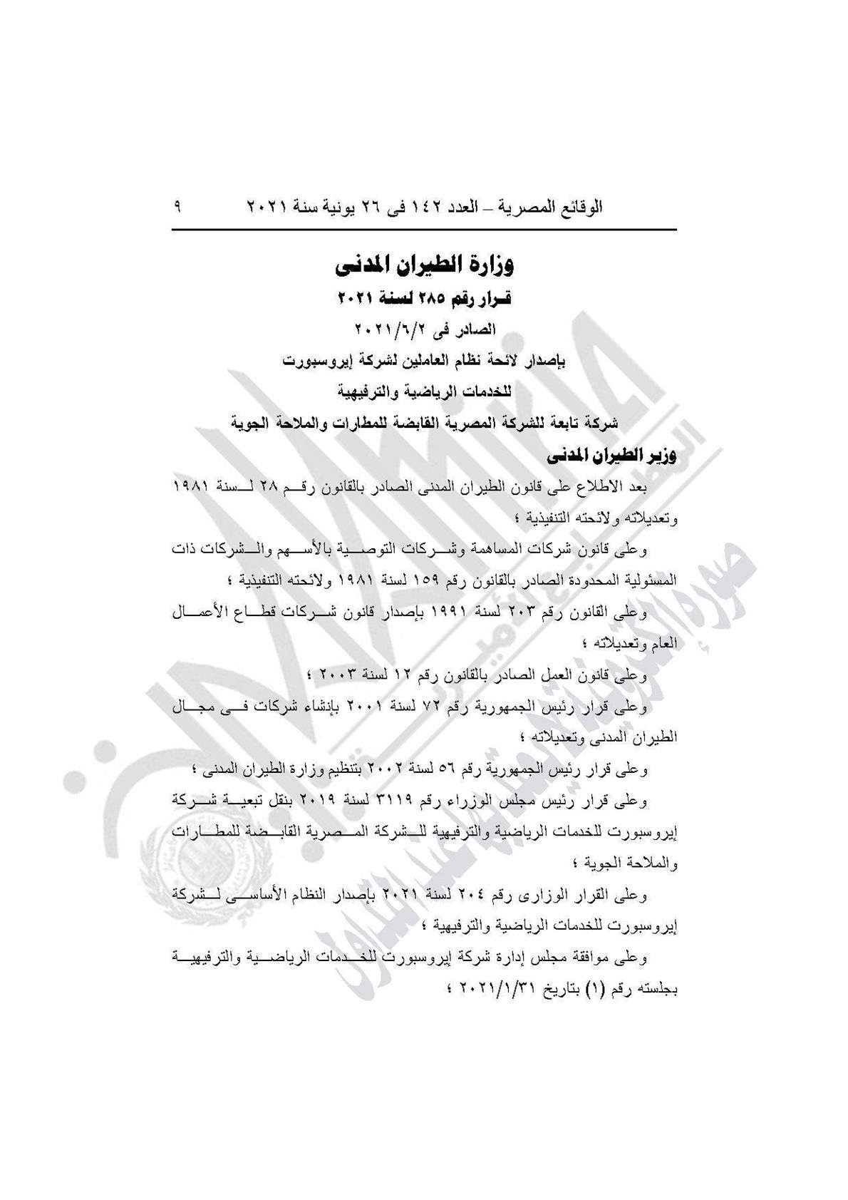 والقرار رقم 285 لسنة 2021، بإصدار لائحة نظام العاملين لشركة إيروسبورت للخدمات الرياضية والترفيهية، شركة تابعة للشركة المصرية القابضة للمطارات والملاحة الجوية.