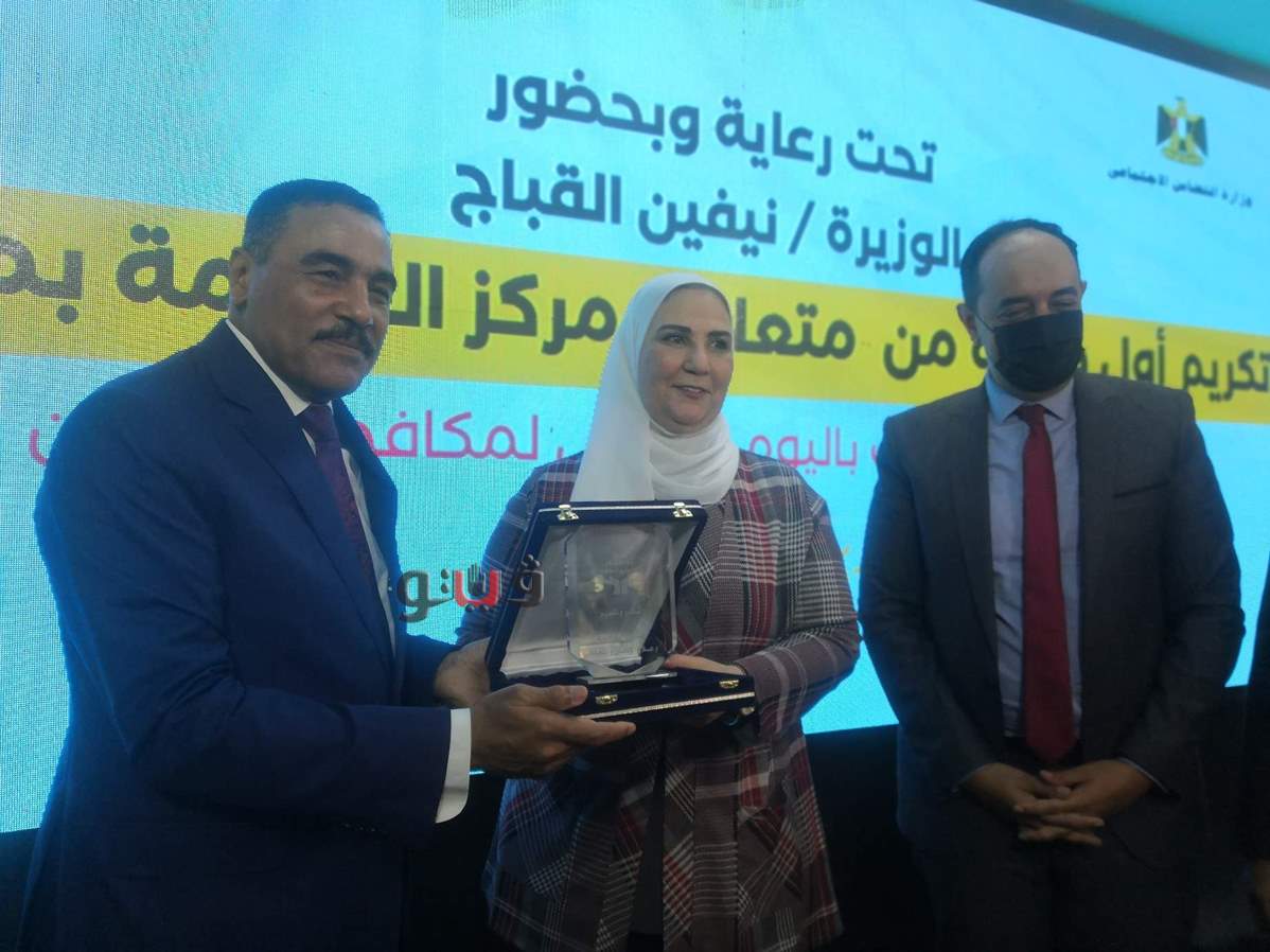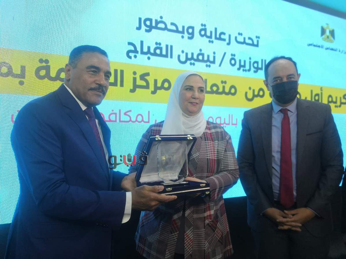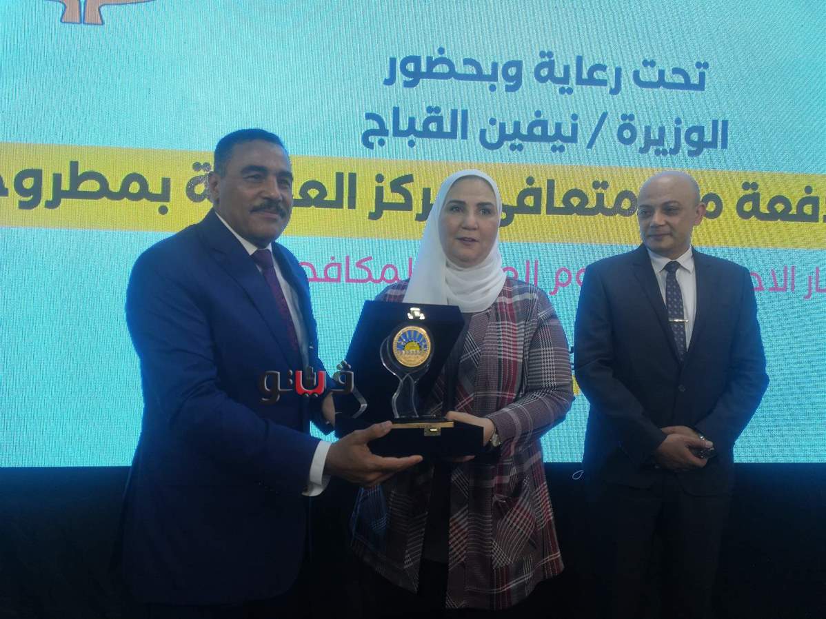 كرم اللواء خالد شعيب محافظ مطروح نيفين القباج وزيرة التضامن الاجتماعي خلال تفقدها مركز العزيمة لعلاج الإدمان بمطروح بتسليمها درع المحافظة.