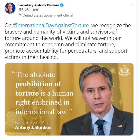 وكتب أنتوني بلينكن تغريدة على تويتر "في اليوم العالمي لمناهضة التعذيب، نعترف بشجاعة وإنسانية ضحايا التعذيب والناجين منه في جميع أنحاء العالم. لن نتنازل عن التزامنا بإدانة التعذيب والقضاء عليه، وتعزيز محاسبة الجناة، ودعم الضحايا بمداواتهم".
