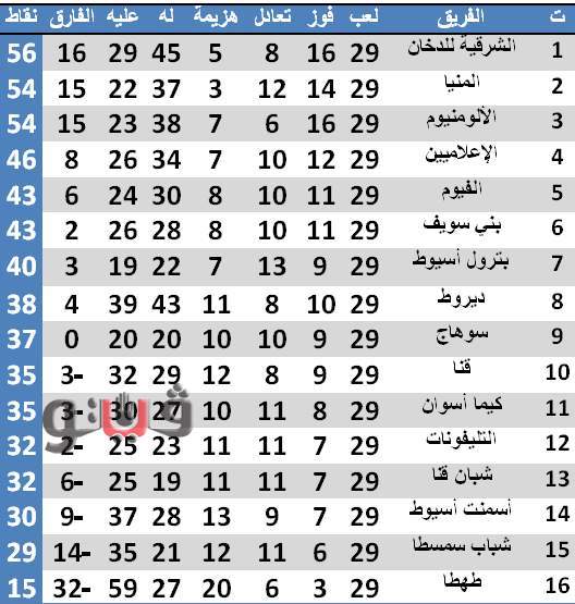 جدول ترتيب مجموعة الصعيد بدوري القسم الثاني قبل الجولة الأخيرة