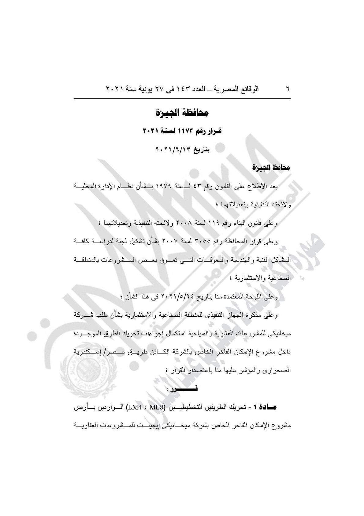 والقرار رقم 1173 لسنة 2021، بشأن تحريك الطريقين التخطيطيين (ML8 ، LM4) الواردين بأرض مشروع الإسكان الفاخر الخاص بشركة ميخانيكى إيجيبت للمشروعات العقارية والسياحية الكائن بالكيلو 6 أيسر طريق مصر/ إسكندرية الصحراوى إلى جانبى الطريق بنفس عرضهما.