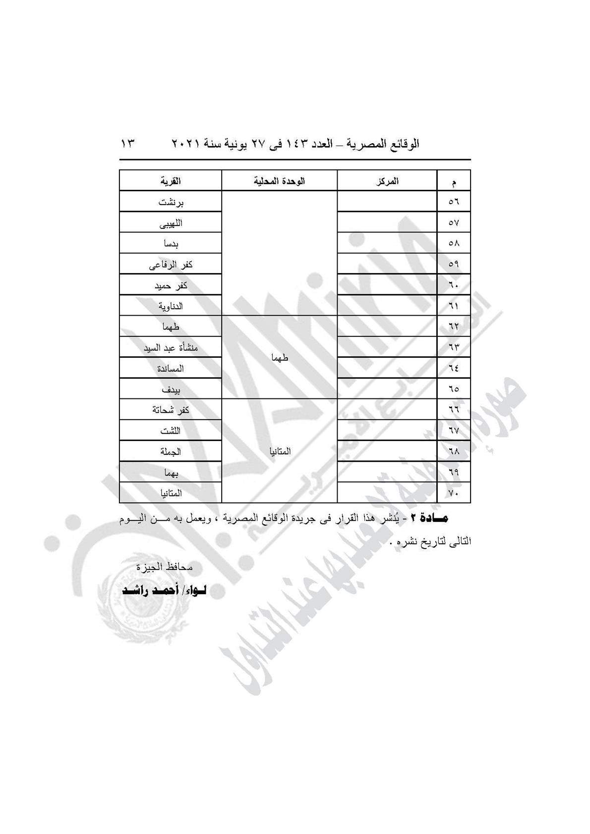 والقرار رقم 1176 لسنة 2021، يعتمد المخطط التفصيلى لعدد (70) قرية من قرى محافظة الجيزة، منهم 13 قرية بإطفيح، وقريتين بالحوامدية، و13 قرية بالصف، و3 قرى بكرداسة، و4 قرى بأوسيم، وجزيرتين بالوراق، و4 قرى بمنشة القناطر، و20 قرية بالعياط، و4 قرى بطهما، و5 قرى بالمتانيا.