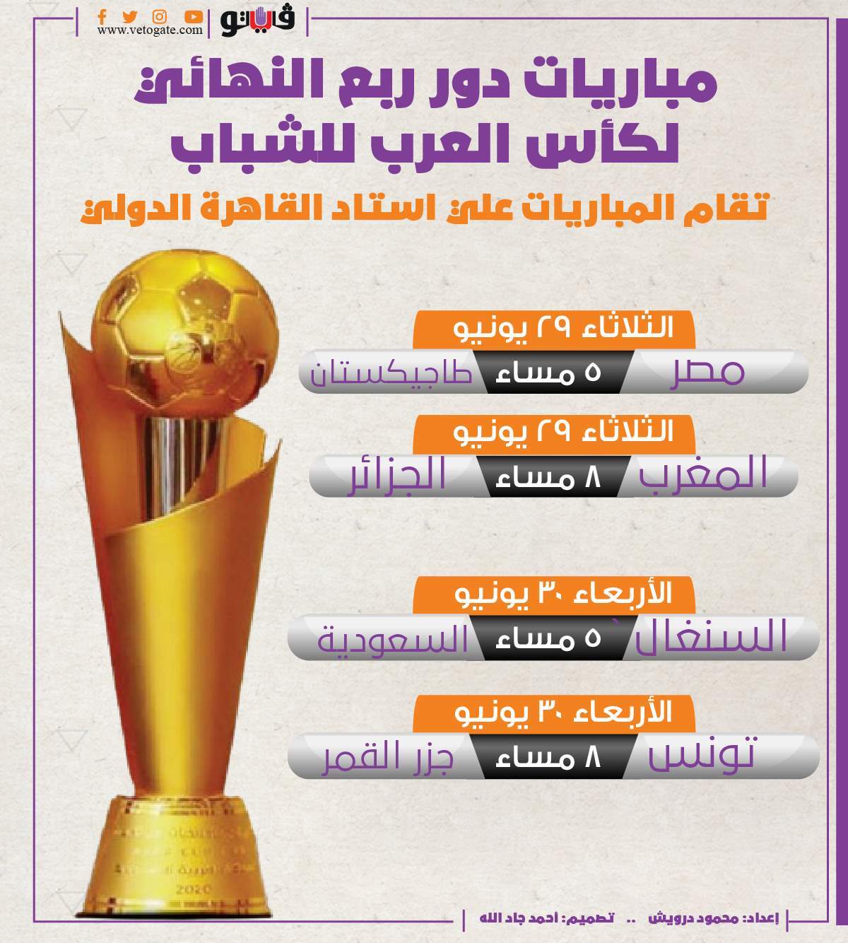 مباريات دور ربع النهائي لكأس العرب للشباب | إنفوجراف الثلاثاء 29/يونيو/2021 - 12:48 م 6/29/2021 12:48:13 PM كأس العرب للشباب محمود درويش شارك طباعة 18 حجم الخط تقام مباريات دور ربع النهائي لكأس العرب للشباب علي استاد القاهرة الدولي. شارك طباعة منتخب مصر للشباب إستاد القاهرة الدولي كأس العرب للشباب السنغال مع السعودية تونس مع جزر القمر المغرب مع الجزائر مصر مع طاجيكستان