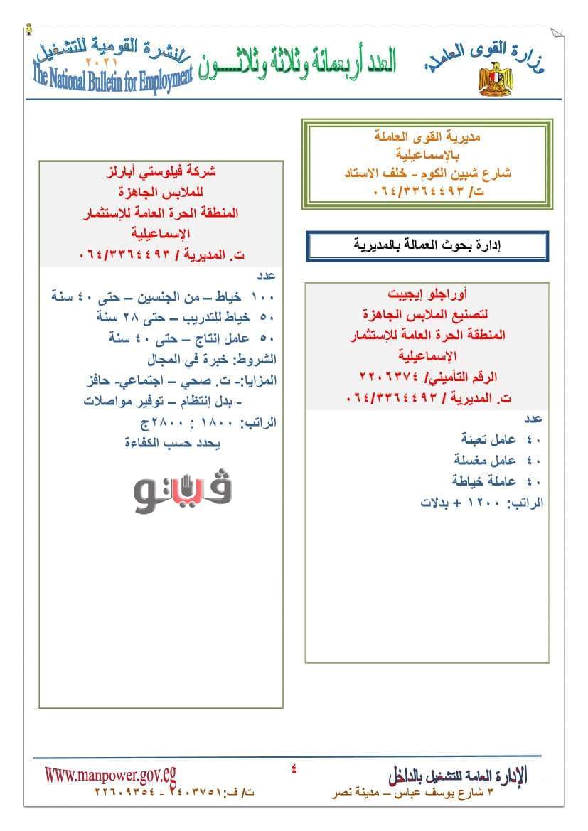 ووفرت مديرية القوى العاملة بالإسماعيلية فرص عمل شملت : 90 عامل إنتاج ، و 40 عامل مغسلة ، و 140 عامل خياطة ، و 50 خياط تحت التدريب .