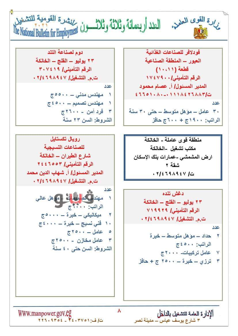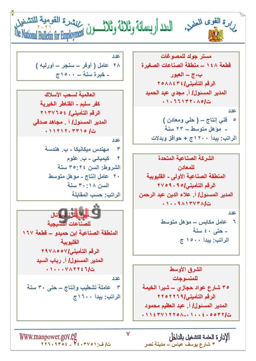 فرص العمل المتوفرة بمحافظة القليوبية تتمثل في 3 مهندس ميكانيكا ، و 3 كيميائي ، ومهندس مدنى براتب 5500 جنيه ، و 6 عمال مخازن ، و7 فرد أمن ، و 20 مندوباً ، و 20 سائق رخصة أولى ، ومهندس تصميم براتب يصل لـ 6000 جنيه ، و 10 مساعد ماكينة ، و20 مساعد قص ، و3 فنى صيانة ، و5 فنى إنتاج ، و6 عمال مكبس ، و 28 عمال اوفر وسنجر واورليه ، و 3 عامل تشطيب ، و 35 عامل ، و 2 حداد ، و7 عمال تركيبات ، و3 ترزي خبرة ، و2 ميكانيكي ، و10 فنى نسيج .