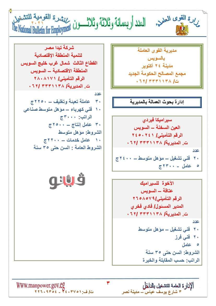 فرص عمل بالسويس ، تمثلت في 40 فنى تشغيل ، و 20 عامل عادي ، و 20 عامل فرز ، و 30 عامل تعبئة وتغليف ، و 10 فنى كهرباء ، و 30 عامل إنتاج .