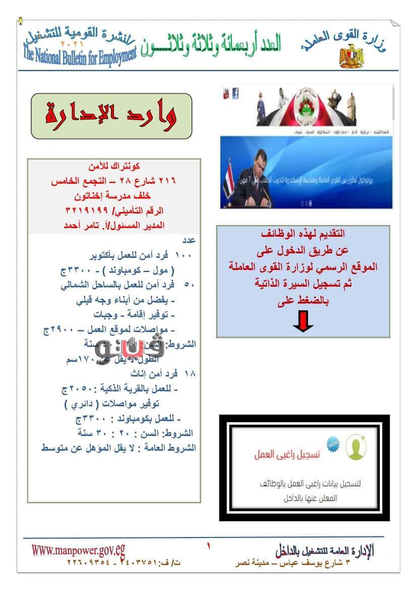 فرص العمل بالقاهرة تتمثل في 435 فرد أمن ذكور ، و 18 فرد أمن من الإناث براتب يصل 3300 جنيه ، و 50 مشرف أمن ، و 25 عامل نظافة براتب 2500 جنيه.