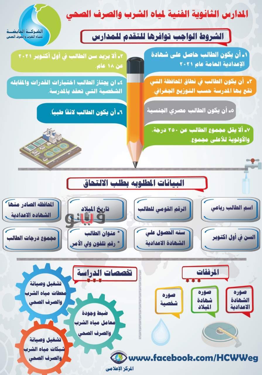 وأعلنت الشركة القابضة لمياه الشرب والصرف الصحي، عن قبول دفعة جديدة بالمدارس الثانوية الفنية لمياه الشرب والصرف الصحي، بمحافظات (القاهرة، البحيرة، بني سويف والمنوفية)، على أن يكون التقديم عبر الموقع الالكترونى لكل شركة ووفقا للتقسيم الجغرافي لكل مدرسة واحتياجات الشركات، فى الفترة من 26 /7 /2021 وحتى 12 /8 /2021.