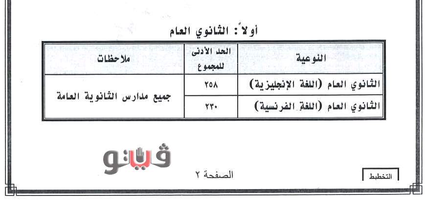 وأوضح الدكتور عربي أبو زيد وكيل وزارة التربية والتعليم بسوهاج أنه تم تحديد 258 درجة كحد أدنى للقبول بالثانوي العام للطلاب دارسي اللغة الإنجليزية بالشهادة الإعدادية، وتحديد 230 درجة كحد أدني للطلاب دارسي اللغة الفرنسية، فيما بلغ الحد الأدنى للقبول بمدرسة سوهاج التجارية المتقدمة خمس سنوات 250 درجة، ومدرسة سوهاج الفندقية السياحية نظام خمس سنوات بحي الكوثر 250 درجة، ومدرسة البلينا الفندقية السياحية نظام خمس سنوات 240 درجة، ومدرسة جامعة سوهاج للتعليم والتدريب المزدوج 265 درجة، لافتا إلى أنه تم تحديد 140 درجة للقبول بجميع مدارس الثانوية الزراعية على مستوى المحافظة.