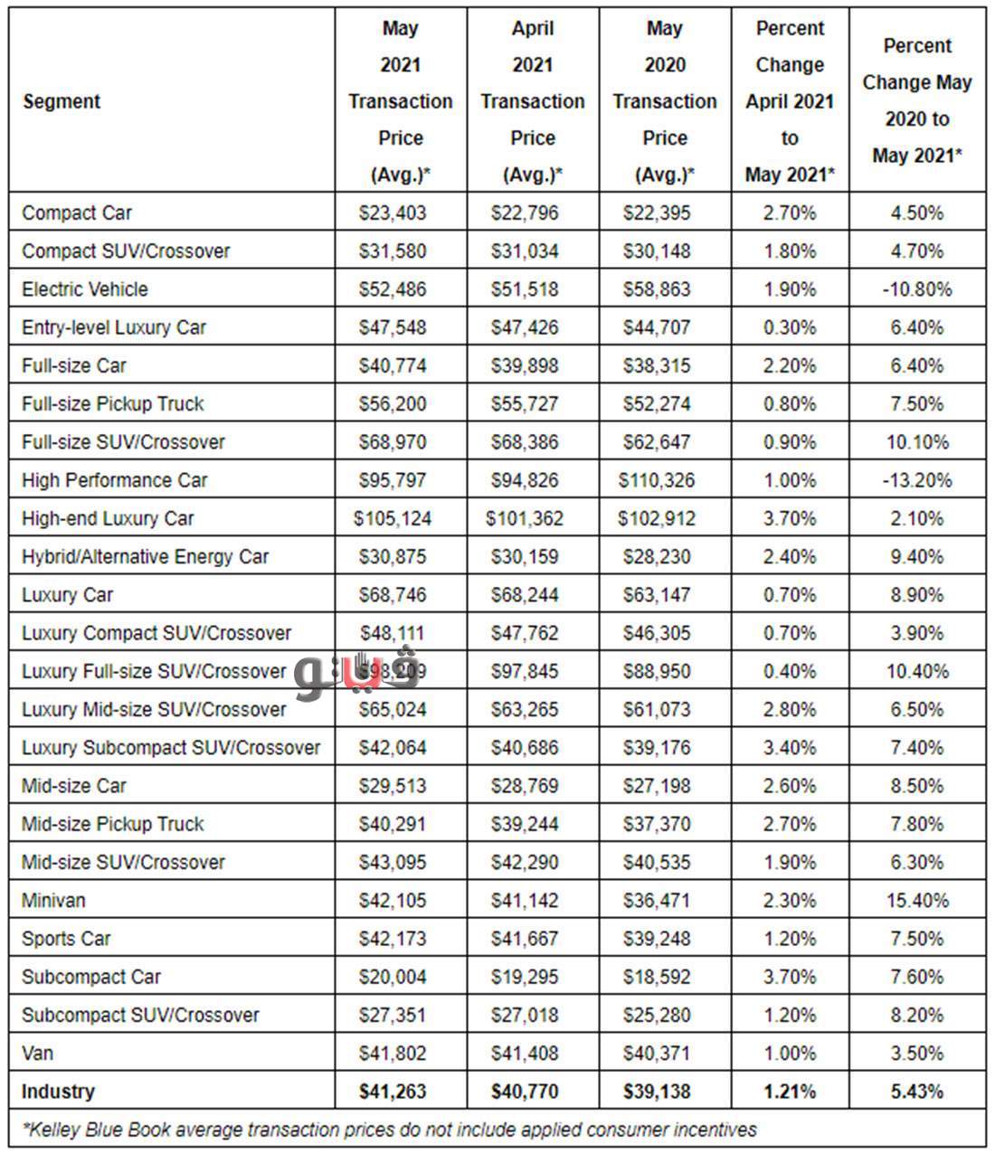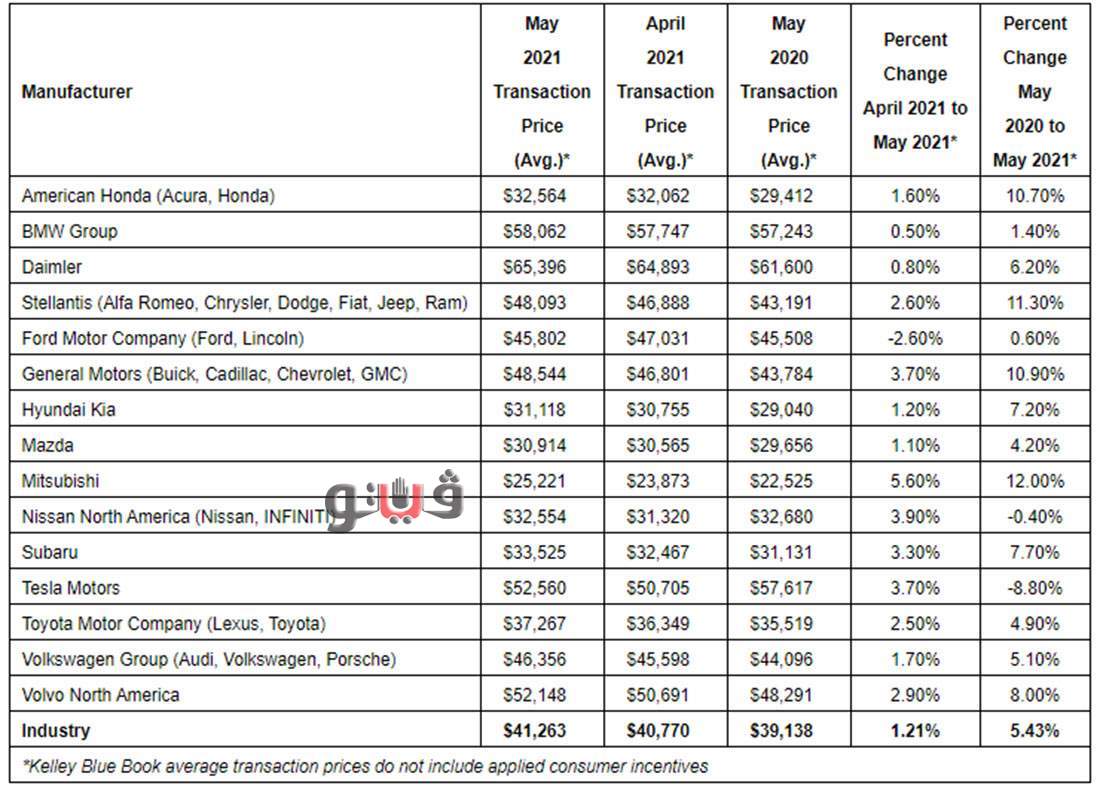 وتكشف الأرقام الصادرة عن كيلي بلو بوك المتخصصة في تقييم المركبات وأبحاث السيارات، أن متوسط السعر الجديد للسيارات من معظم العلامات التجارية الكبرى في الولايات المتحدة قد ارتفع عن العام الماضي وقفز أيضًا من أبريل إلى مايو 2021 على خلفية الطلب المتزايد على السيارات الجديدة والإمدادات المحدودة بسبب استمرار نقص أشباه الموصلات.