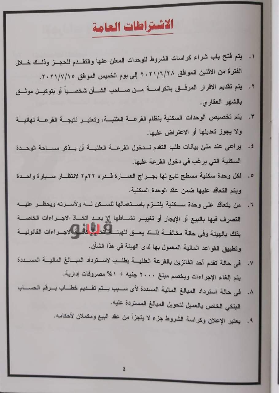 _ سحب كراسة الشروط من مقر الهيئة العامة لتعاونيات البناء في مدينة نصر في موعد غايته 15 يوليو المقبل، ويتم الانتهاء من تقديم المستندات وسداد مبلغ جدية الحجز، ويتم إرفاق إيصال السداد مع الأوراق المطلوبة، على أن يتم إجراء القرعة العلنية اليدوية بين المتقدمين لحجز الوحدات في 28 من يوليو المقبل.