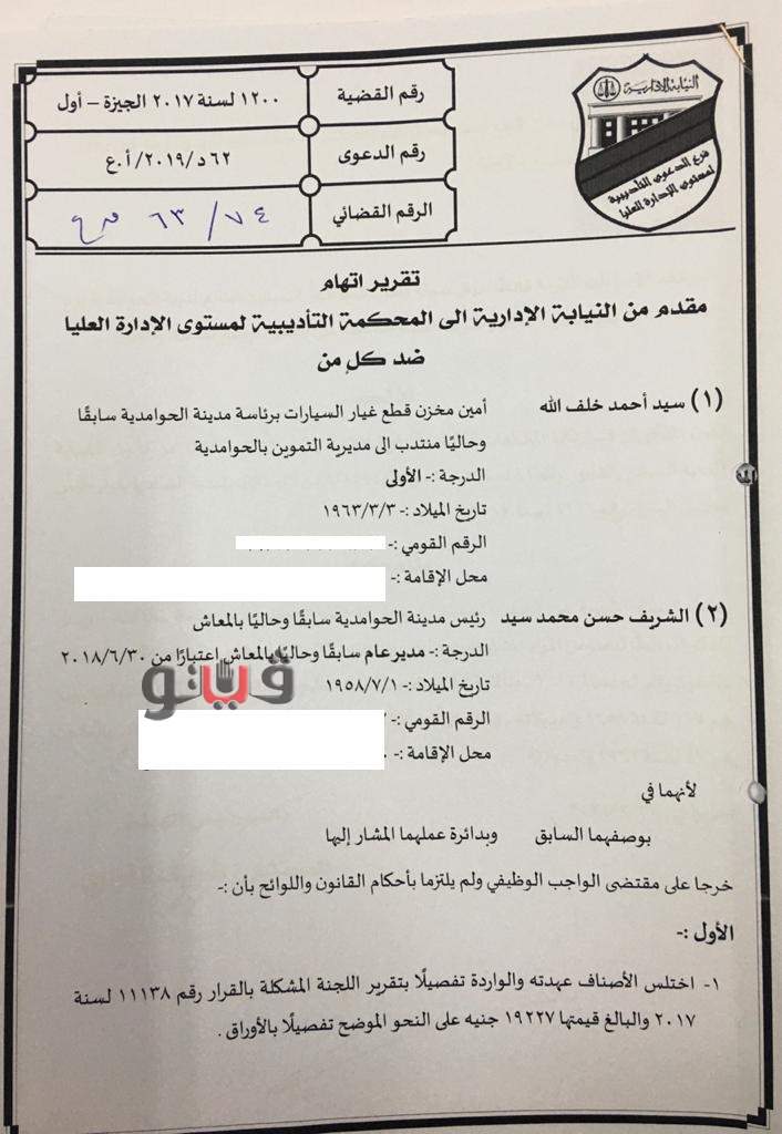 قررت النيابة الإدارية في القضية رقم 74 لسنة 63 قضائية عليا إحالة رئيس مدينة الحوامدية بمحافظة الجيزة وأمين مخزن قطع الغيار برئاسة المدينة للمحاكمة التأديبية العاجلة بعد ثبوت خروجهما على مقتضى الواجب الوظيفي ولم يلتزما بأحكام القانون واللوائح وأرتكابهما مخالفات مالية وإدارية وقانونية.