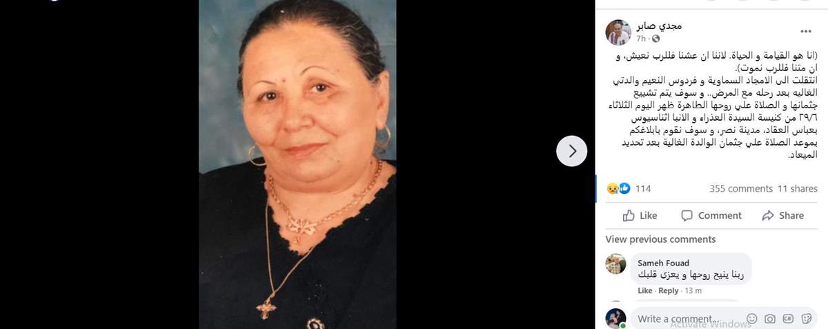 وعلى حسابه بموقع "فيس بوك" قال: "انا هو القيامة والحياة. لأننا أن عشنا فللرب نعيش، وان متنا فللرب نموت.. انتقلت إلى الأمجاد السماوية وفردوس النعيم والدتي الغالية بعد رحلة مع المرض.. وسوف يتم تشييع جثمانها والصلاة على روحها الطاهرة الساعة 12.30 اليوم الثلاثاء من كنيسة السيدة العذراء والأنبا أثناسيوس في عباس العقاد، مدينة نصر".