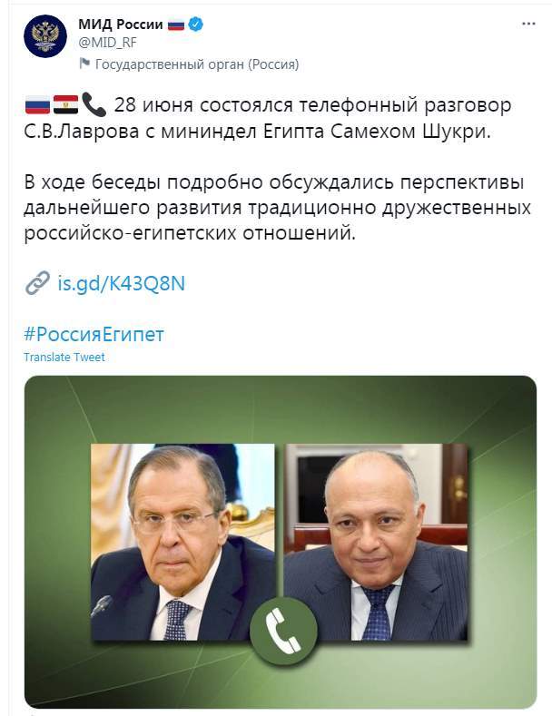 وكتبت وزارة الخارجية الروسية تغريدة على تويتر: "في 28 يونيو، اتصل سيرجي لافروف هاتفيًا بنظيره وزير الخارجية المصري سامح شكري، وأثناء المحادثة، ناقش الوزيران تفاصيل تطور مستقبل العلاقات الودية التقليدية بين مصر وروسيا".