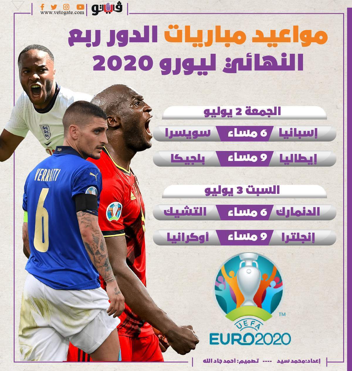 مواعيد مباريات الدور ربع النهائي ليورو 2020 | انفو جراف الأربعاء 30/يونيو/2021 - 04:29 م 6/30/2021 4:29:36 PM يورو 2020 محمد سيد شارك طباعة 18 حجم الخط انتهت مباريات دور الستة عشر من بطولة يورو 2020، وتحددت منتخبات دور ربع النهائي. شارك طباعة سويسرا يورو 2020 التشيك أوكرانيا بلجيكا اسبانيا إنجلترا الدنمارك إيطاليا