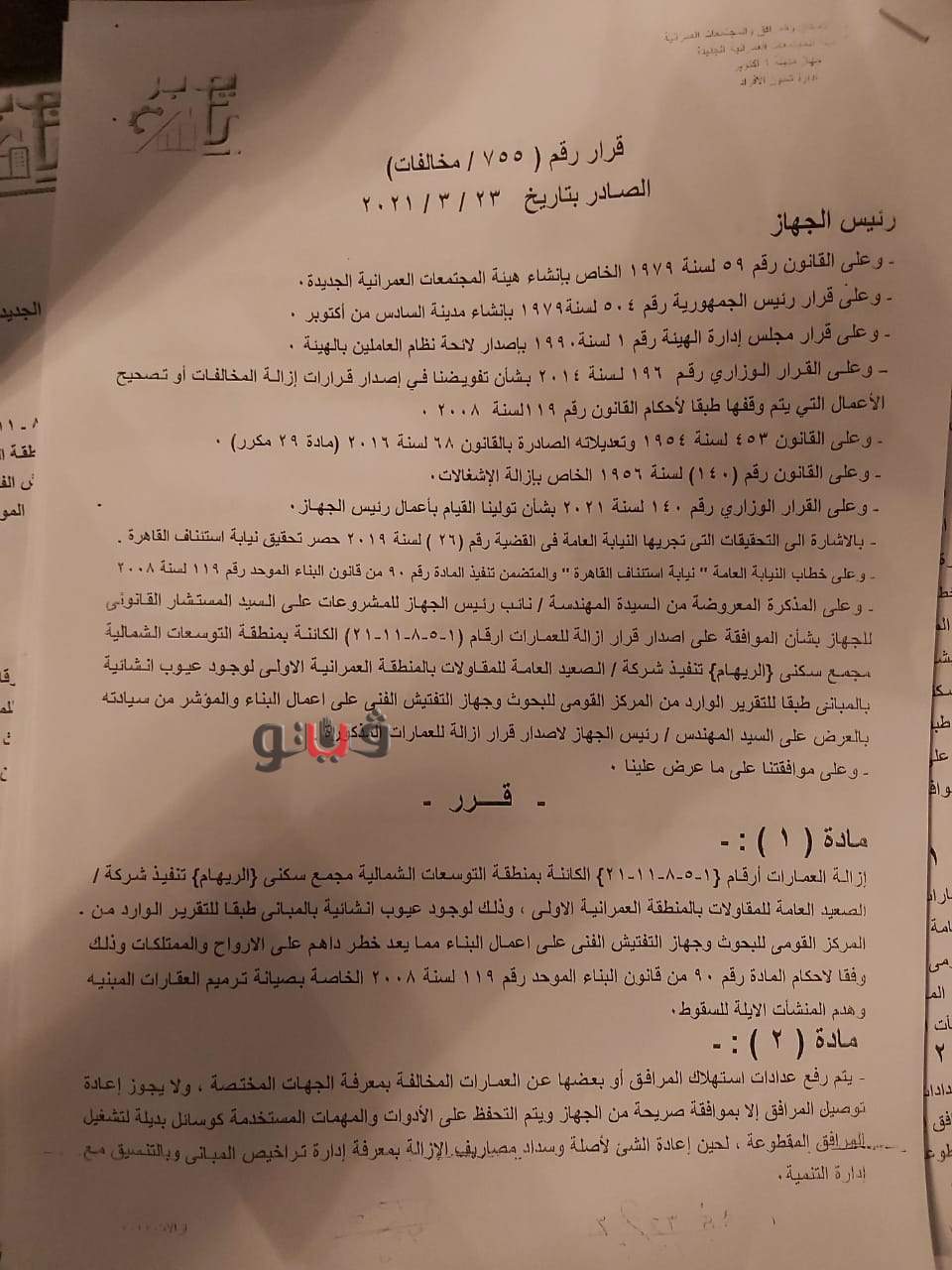 نستغيث نحن سكان مشروع الريهام الكائن بالتوسعات الشمالية بمدينة 6 أكتوبر، والذي نفذته شركة الصعيد العامة للمقاولات، بكم لإنقاذ أرواح الأسر المقيمة بالمشروع، والذي صدر بشأنه قرار من النيابة العامة "استئناف القاهرة" بإزالة 5 عقارات.