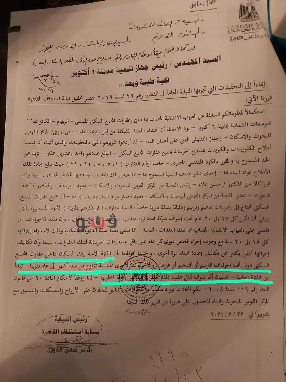 حيث أكدت اللجنة المشكلة من النيابة أن أملاح الكولوريدات والكبريتات بمسطح الخرسانة بجميع عقارات المجمع السكني البالغ عددها 21 عقارا تزيد عن الحد المسموح به، حيث تبلغ نسبة زيادة تلك الأملاح في مواد البناء أحد عشر ضعف النسبة المسموح بها؛ مما يعرض تلك العقارات وقاطنيها للخطر الداهم.