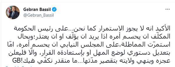 وكتب جبران باسيل تغريدة على تويتر "الأكيد انه لا يجوز الاستمرار كما نحن… على رئيس الحكومة المكلّف ان يحسم أمره اذا يريد ان يؤلّف او ان يعتذر؛ وبحال استمرّت المماطلة، على المجلس النيابي ان يحسم أمره، امّا بتعديل دستوري لوضع المهل او بإستعادةه القرار، والّا فليعلن عجزه وينهي ولايته بتقصير مدّتها… ما منقدر نكفّي هيك!"
