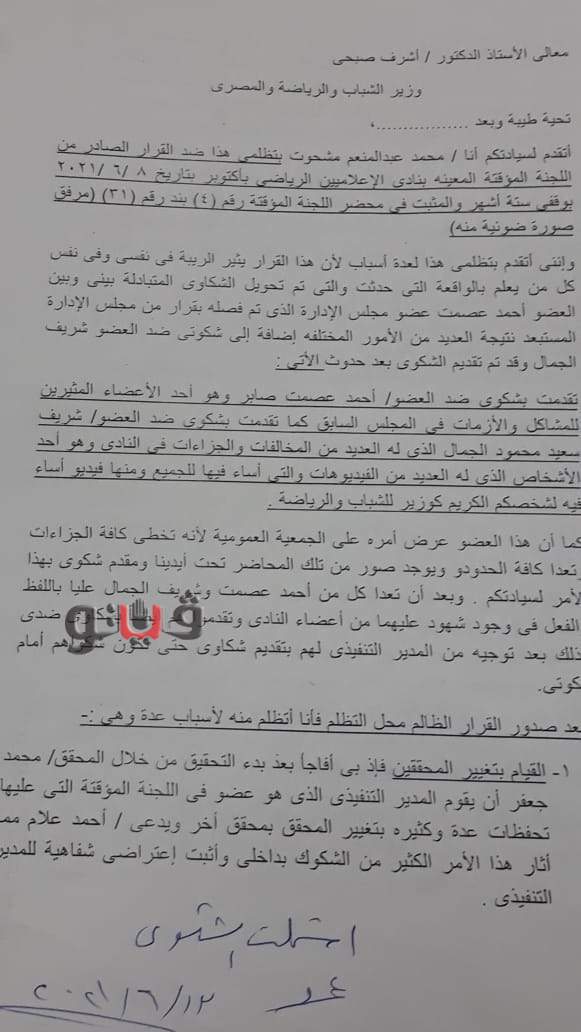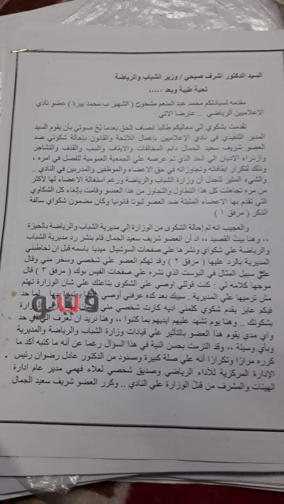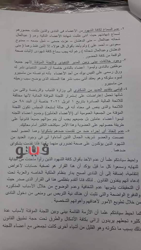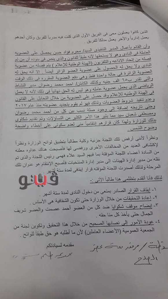 وكانت شكاوى للوزارة تضمنت اتخاذ مجلس الإدارة السابق عقوبات بالإيقاف ضد العضو، إلا أنهم تفاجأوا بأن اللجنة المؤقتة التي عينتها وزارة الشباب والرياضة إدارة النادي رفعت تلك العقوبات ويتواجد العضو باستمرار في النادي، وهو ما دفعهم لتقديم شكاوى في وزارة الشباب والرياضة ضد هذا العضو وضد اللجنة المؤقتة.