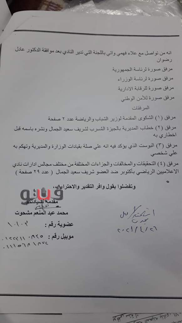 كما تقدم محمد عبد المنعم مشحوت بشكوى للدكتور أشرف صبحي وزير الشباب والرياضة، بداعي تشكيل لجنة مؤقتة من العاملين بالنادي وليس من الأعضاء العاملين، بجانب رفع إيقاف العضو شريف الجمال رغم تقديم 8 شكاوى ضده وثبت إدانته بهم ما بين التعدي على مدربين وعاملين وأعضاء عاملين، وهو ما دفع المجلس السابق لإيقافه، بداعي العلاقة القوية بينه وبين أحد وكلاء الوزارة.
