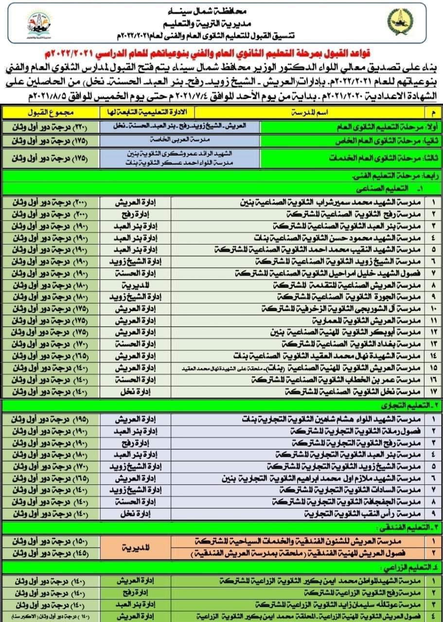 وصدق المحافظ على درجات القبول فى مدارس التعليم الصناعي بإدارة العريش التعليمية ٢٠٠ درجة وإدارة رفح ٢٠٠ درجة وإدارة بئر العبد ١٩٠ درجة وإدارة الشيخ زويد والحسنة ١٩٠ درجة.