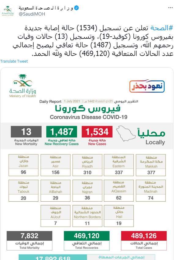 وكتبت وزارة الصحة السعودية تغريدة على تويتر "#الصحة.. تعلن عن تسجيل (1534) حالة إصابة جديدة بفيروس كورونا (كوفيد-19)، وتسجيل (13) حالات وفيات ، وتسجيل (1487) حالة تعافي ليصبح إجمالي عدد الحالات المتعافية (469,120) حالة".
