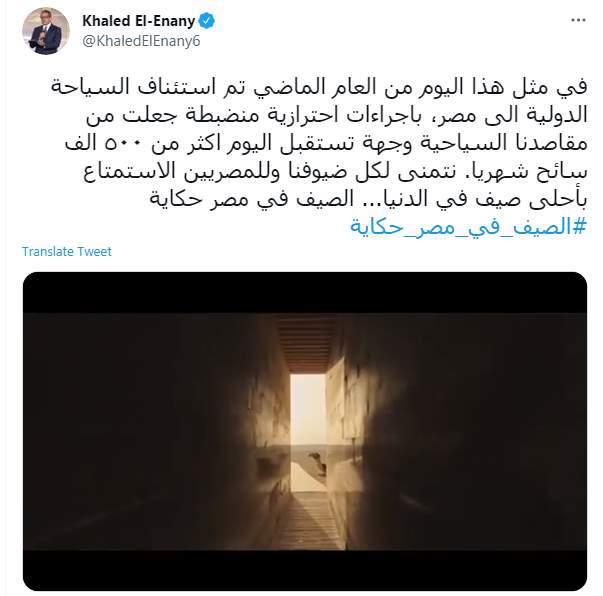 في مثل هذا اليوم من العام الماضي تم استئناف السياحة الدولية الى مصر، باجراءات احترازية منضبطة جعلت من مقاصدنا السياحية وجهة تستقبل اليوم أكثر من ٥٠٠ ألف سائح شهريا. نتمنى لكل ضيوفنا وللمصريين الاستمتاع بأحلى صيف في الدنيا... الصيف في مصر حكاية#الصيف_في_مصر_حكاية pic.twitter.com/vdEMULLKTt— Khaled El-Enany (@KhaledElEnany6) July 1, 2021