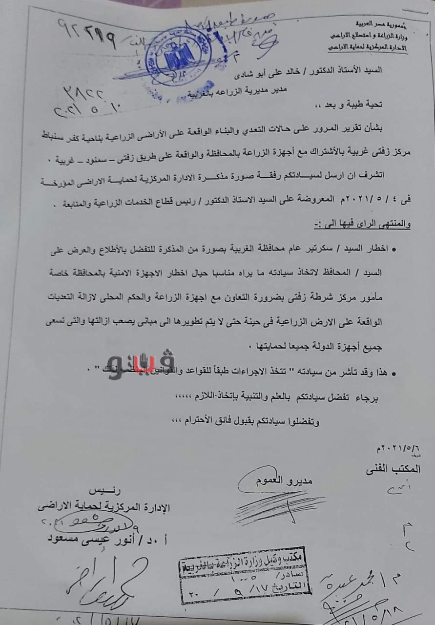 وجه الدكتور أنور عيسى مسعود رئيس الإدارة المركزية لحماية الأراضي بوزارة الزراعة، مذكرة إلى مدير مديرية الزراعة بالغربية بشأن إخطار سكرتير عام محافظة الغربية لاتخاذ ما يلزم حيال إخطار الأجهزة الأمنية بالمحافظة، خاصة مركز زفتي بضرورة التعاون مع أجهزة الزراعة والحكم المحلي لإزالة التعديات الواقعة على الأرض الزراعية في حينه، حتى لا يتم تطويرها ويصعب إزالتها، والتي تسعى جميع أجهزة الدولة جميعا لحمايها.