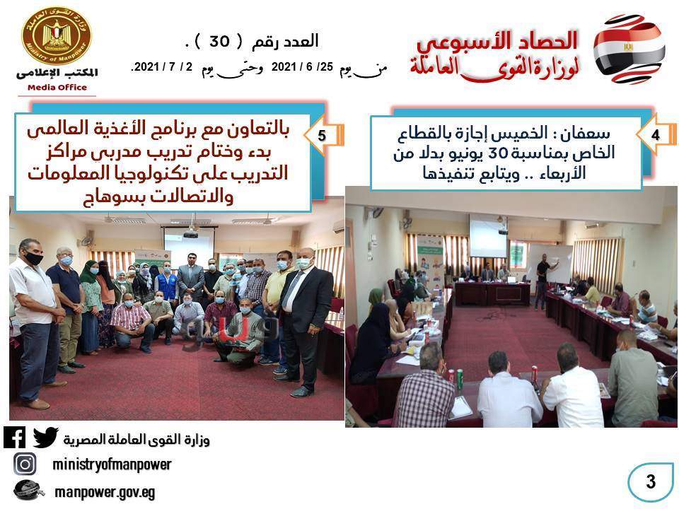 كما تم بدء وختام فعاليات الدورة التدريبية المتخصصة فى مجال تكنولوجيا المعلومات والاتصالات فى مديرية القوى العاملة بسوهاج، وتدريب 20 من كوادر مدربي مراكز التدريب المهني وبعض الإدارات المرتبطة بالتدريب، وتستمر الدورة حتى الخميس المقبل.