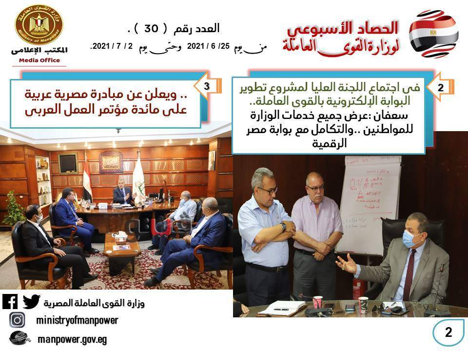 وعلى جانب آخر، عقد وزير القوى العاملة، اجتماعا بديوان عام الوزارة، وأعضاء اللجنة العليا والتنفيذية ممثلي كل من الإدارات المركزية بالوزارة، ووزارة الاتصالات والشركة المنفذة لمشروع تطوير البوابة الإلكترونية لوزارة القوى العاملة.