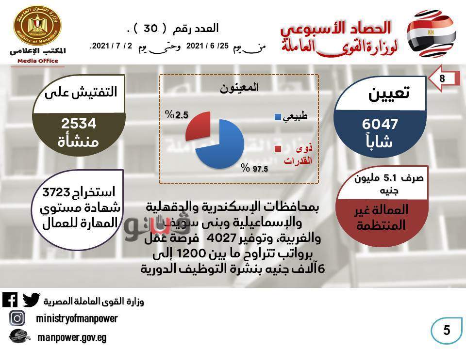 وشمل حصاد الأسبوع تعيين 6 آلاف و47 شابا في 5 محافظات، وصرف منح للرعاية الاجتماعية والصحية للعمالة غير المنتظمة المسجلة بمديريات القوى العاملة ومحافظات الإسكندرية، والدقهلية، والإسماعيلية، وبنى سويف، والغربية، بلغت 5 ملايين، و164 ألفاً و406 جنيهات، والتفتيش على 2534 منشأة لتطبيق أحكام القانون، فضلاً عن استخراج 3723 شهادة قياس مستوى المهارة، ورخصة مزاولة الحرفة لـ 3723 عاملا.