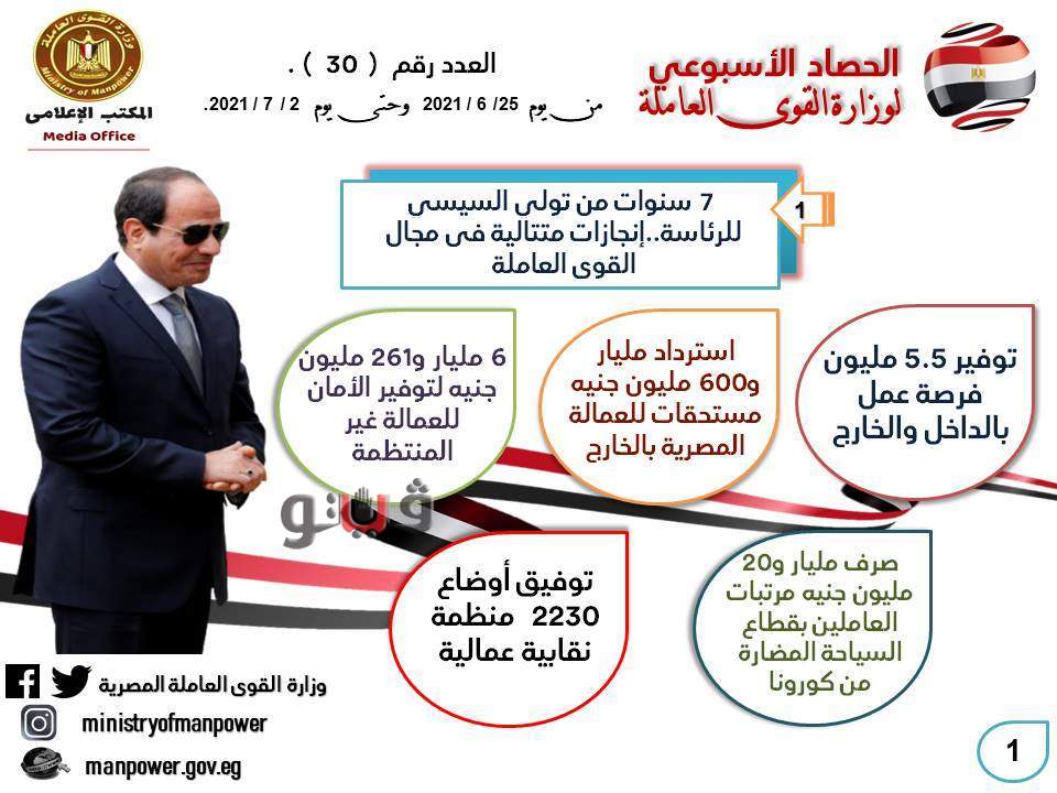كما قامت الوزارة باسترداد مليار و600 مليون جنيه مستحقات للعمالة المصرية بالخارج، وساهمت في خفض معدل البطالة من 13% إلى 7.2%، وصرف 6 مليارات و261 مليون جنيه لتوفير الأمان للعمالة غير المنتظمة، وصرف مليار و20 مليون جنيه مرتبات العاملين بقطاع السياحة المضارة من كورونا، وتطوير 38 مركز تدريب ثابتا.. وتطوير وتحديث 27 وحدة متنقلة للتدريب على 3 مهن يحتاجها سوق العمل، والبدء في التحول الرقمى لإنجاز الأعمال بسرعة ويسر لتقديم خدمة أفضل للمواطن، وكذلك توفيق أوضاع 2230 منظمة نقابية عمالية، وفوز 18000 عضو، وتأسيس 100 منظمة نقابية جديدة.