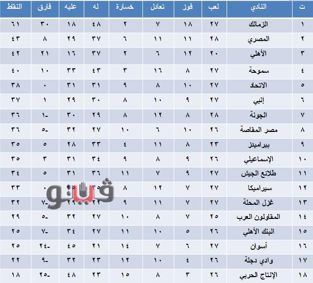 ويواصل الزمالك صدارة جدول ترتيب الدوري الممتاز برصيد 61 نقطة، ويليه المصري ثانيا برصيد 43 نقطة ثم الأهلي ثالثا برصيد 42 نقطة.