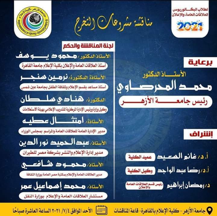 وإشراف عام من الدكتور "سامح البدري" والدكتور "علاء خليفة" المدرسين بالكلية، يقدم طلاب قسم العلاقات العامة بكلية الإعلام جامعة الأزهر عددًا من مشروعات التخرج التي تميزت بالرؤى الثاقبة والأفكار الجيدة التي تساهم في مسيرة التنمية والتطوير كونها لامست الواقع وسلطت الضوء على متطلبات الوقت الراهن وكذلك المستقبل من خلال طرح القضايا وإيجاد الحلول.